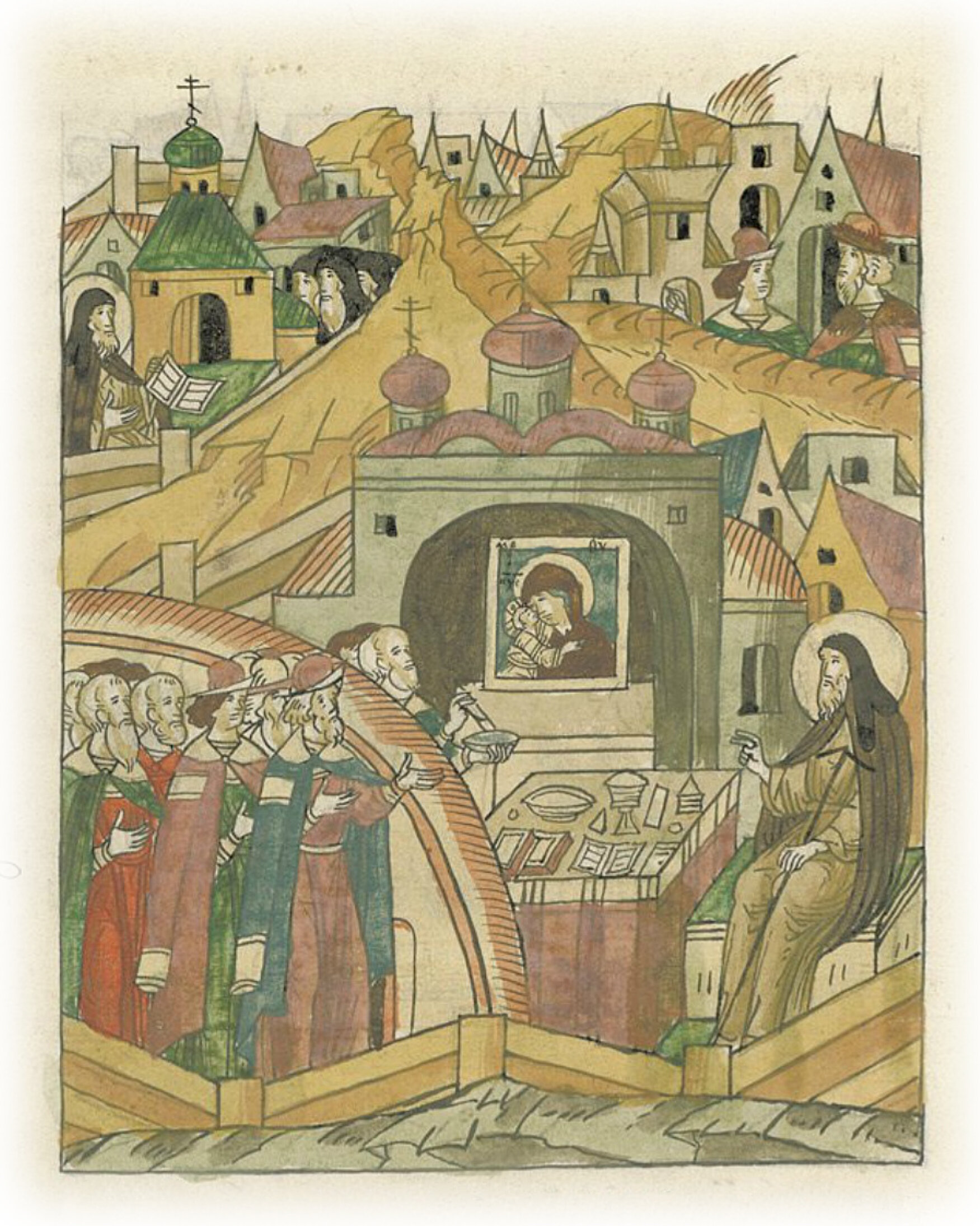 а в чернечестве и в поповстве, и в игуменстве был 30 лет. А как ушел в то место, где и обитель поставил (во имя) пресвятой владычицы нашей Богородицы честного ее Рождества, и церковь воздвиг сначала деревянную, потом же каменную устроил, и расписал ее чудно, и украсил ее иконами и книгами, и всякою утварью церковной, так что дивились и сами те Русской земли самодержцы. И при жизни его приходили за благословением и молитвами о них, словно к древним преподобным отцам земли нашей; также и прочие князья и бояре, и прочие православные христиане, и от Литовской земли, и от прочих стран благословения и молитвы прося от него. А был в своей обители 33 года.