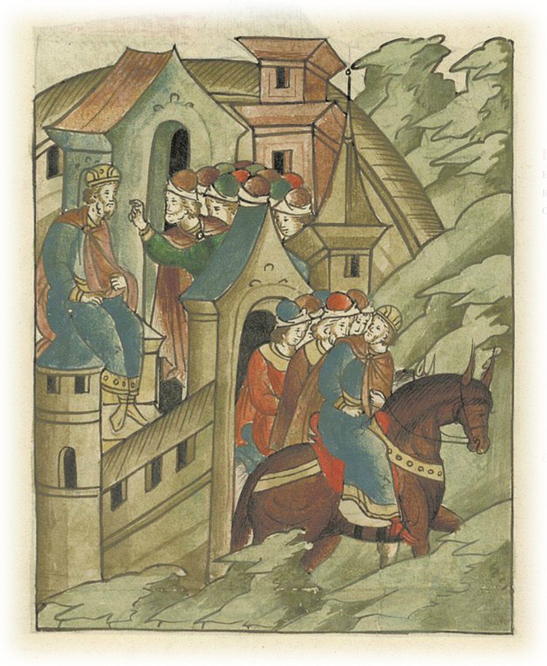 Ругодивские посадники Яким и Захар приезжают в Москву. Воеводы царя Ивана Васильевича Алексей Адашев и Иван Михайлов сообщают им, что государь пожалует их, если сдадут его воеводам помимо Ругодива Вышгород.