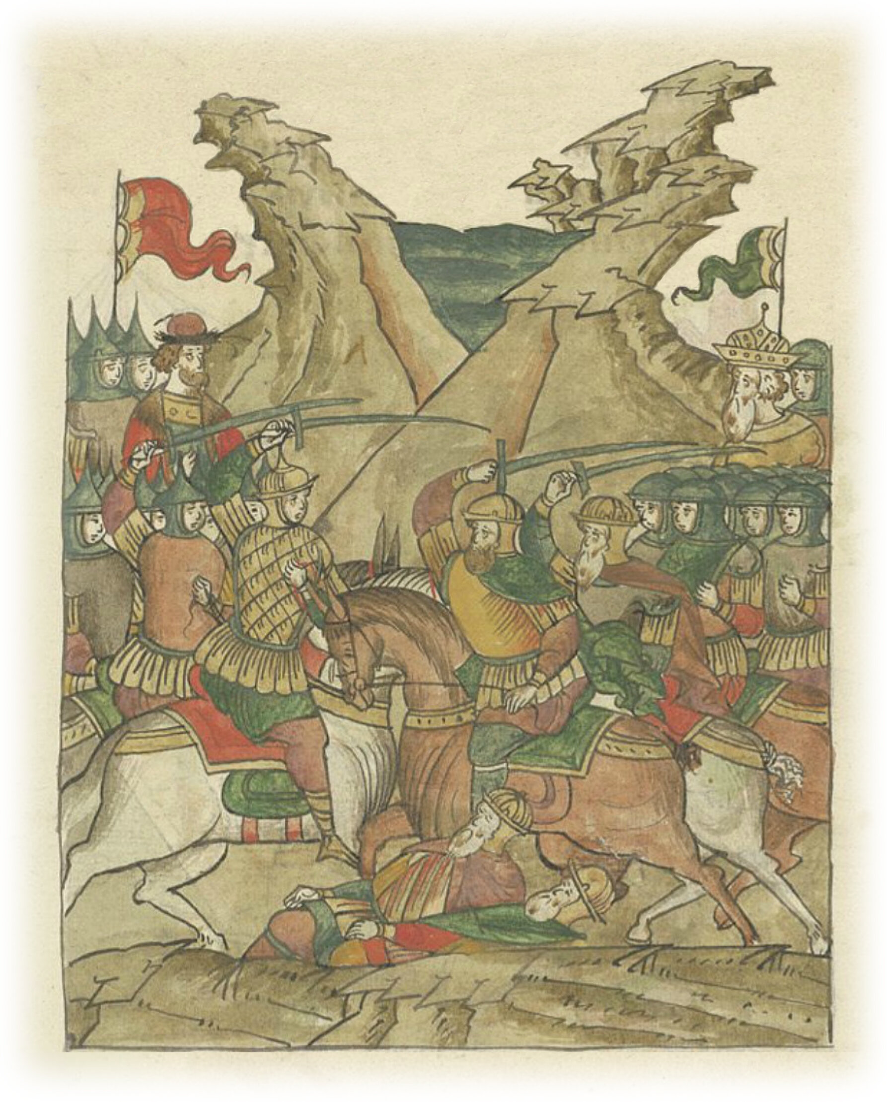 и, снова наехав, бился крепко с самим воеводой посреди полка их, и убит был воевода их Спиридон, и епископ их убит был тут же.