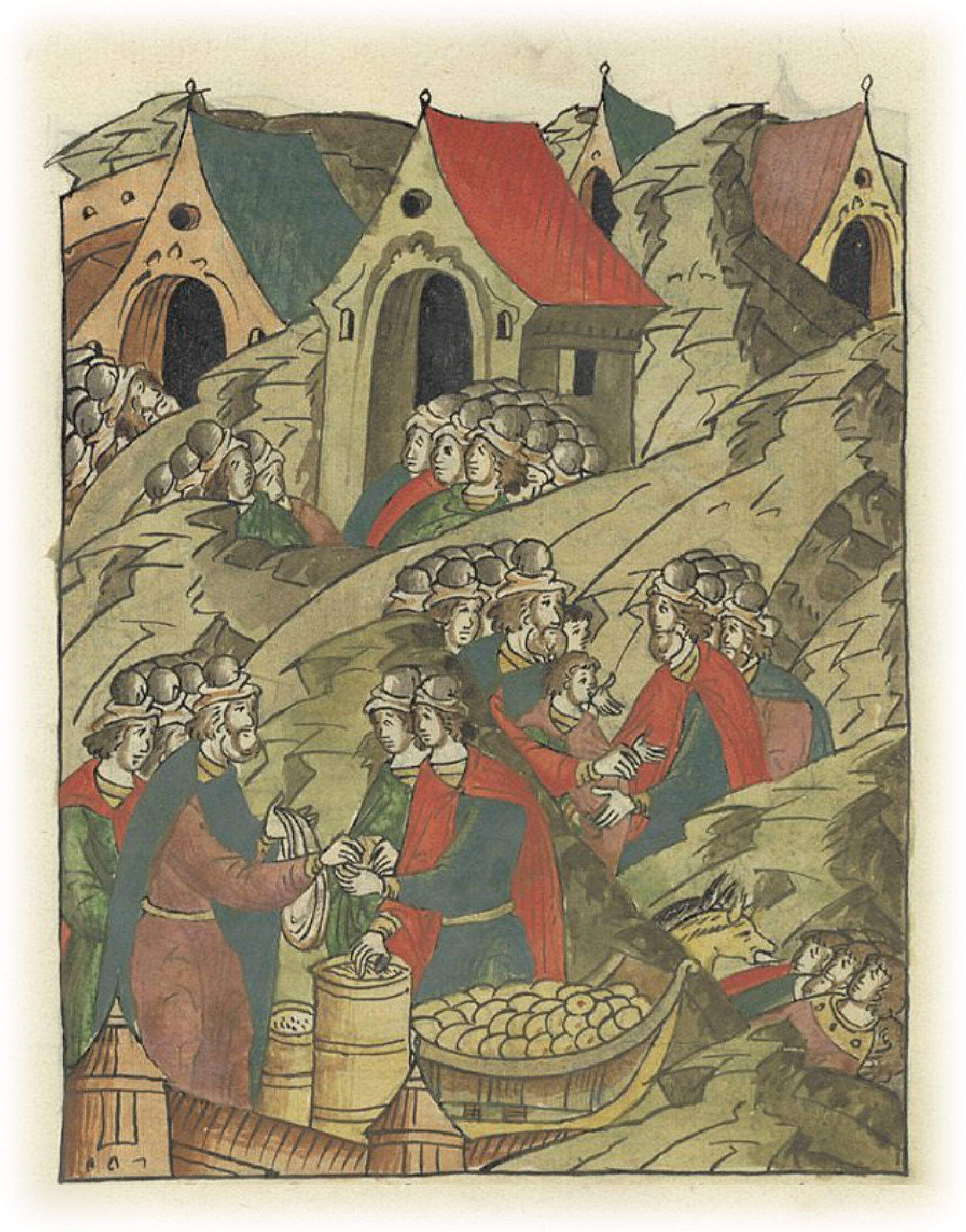 И была в Новгороде кадь* ржы по десять гривен, овса кадь – по три гривны, а репы воз – по две гривны. И был тогда голод великий, детей своих давали в рабство за хлеб. И много выкопали могил и побросали туда мертвых, потому что даже некому было погребать людей, и псы не могли съесть всех мертвых. * мера сыпучих тел, в основном зерна