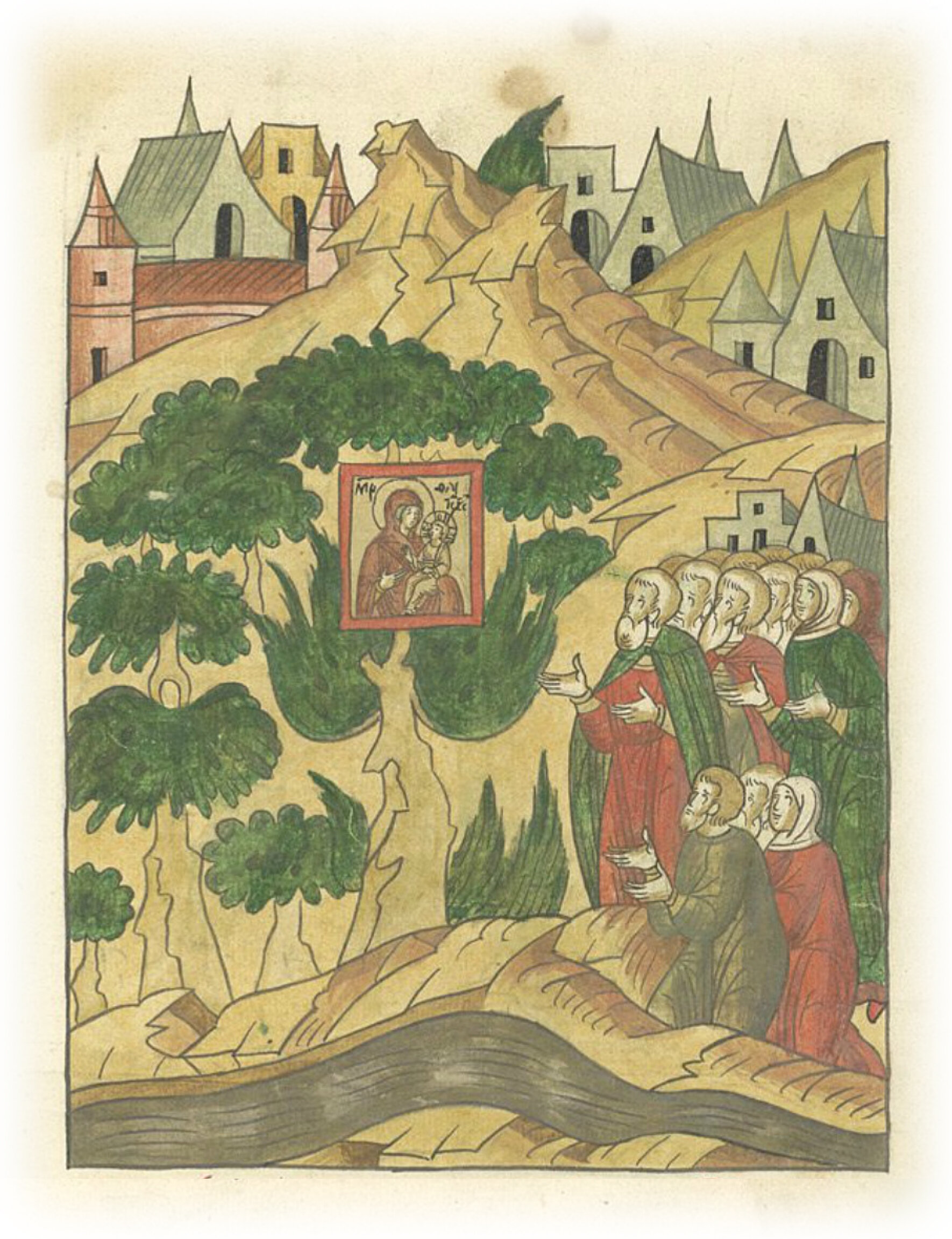 Начало явления образа Пречистой Богородицы, что на Тихвине. В том же году явилась икона - образ Пречистой Богородицы Одигитрии в области Великого Новгорода, в Обонежской пятине, на Ояти, в Выченицах, сто верст от города; а того никто же не ведал, откуда явилась. И были от той иконы образа Пречистой чудеса многие.