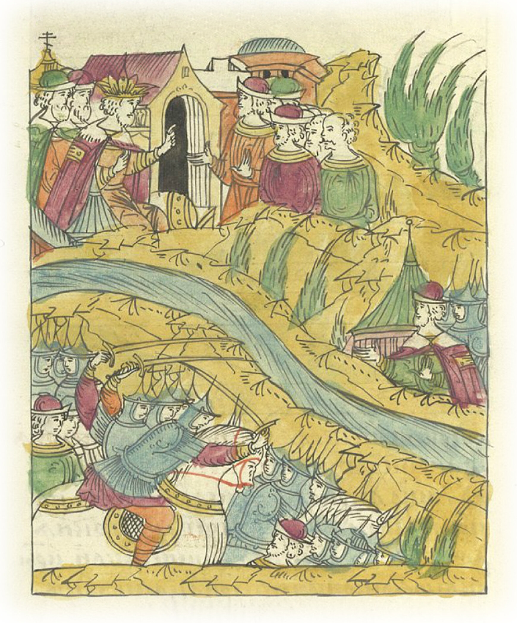 Языки говорят воеводам царя Ивана Васильевича, что магистр окопался большим рвом вокруг города Рындола, бьет из пушек и пищалей и приступает к Рындолу.