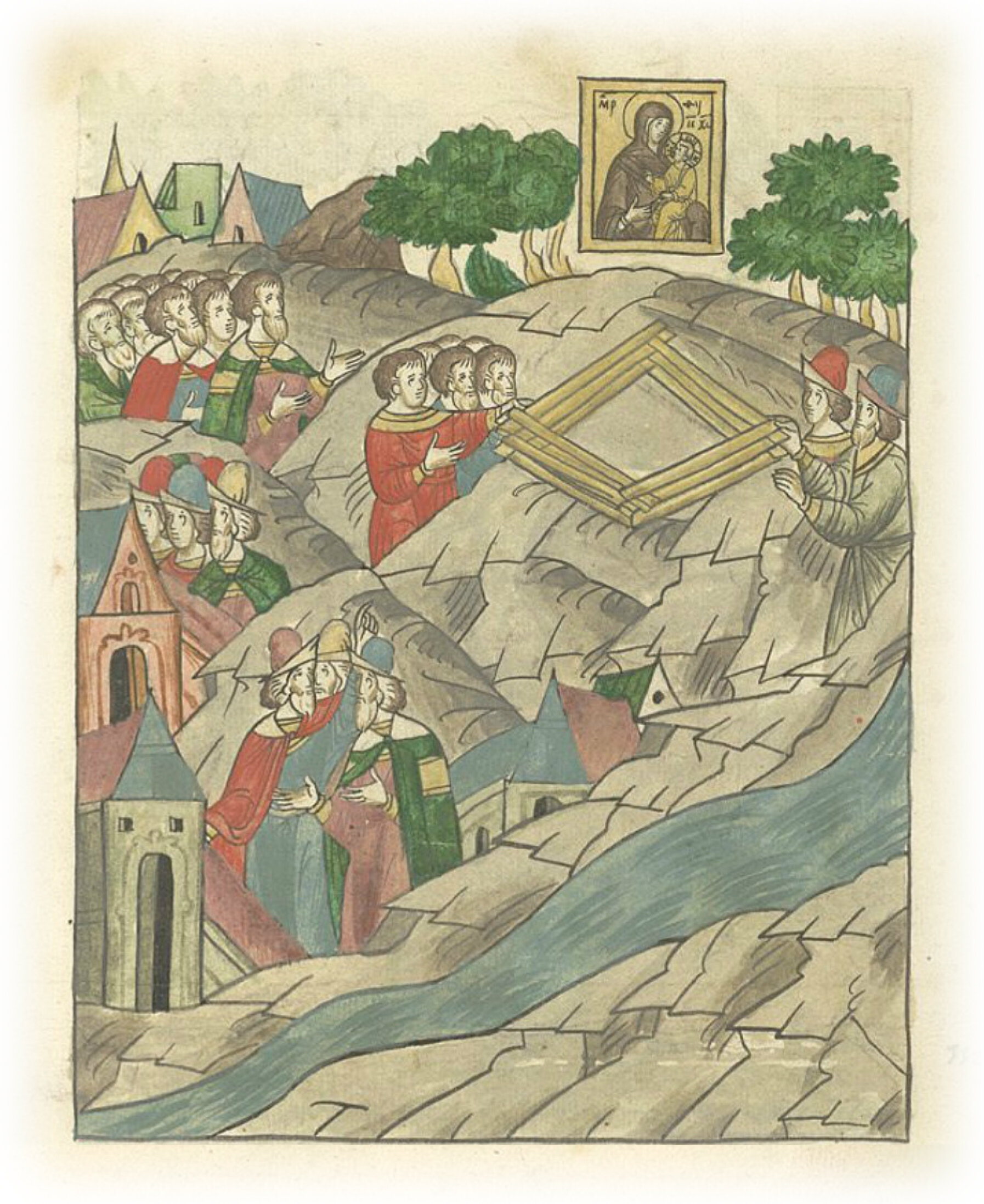 И оттуда явилась на Тихвине, над рекою, на горе, икона – образ Пречистой, на воздухе; и собралось множество народа на великое это чудо; и на том месте, на горе, заложили церковь, три венца, во имя честного Ее Успения, и к ночи разошлись люди по домам.
