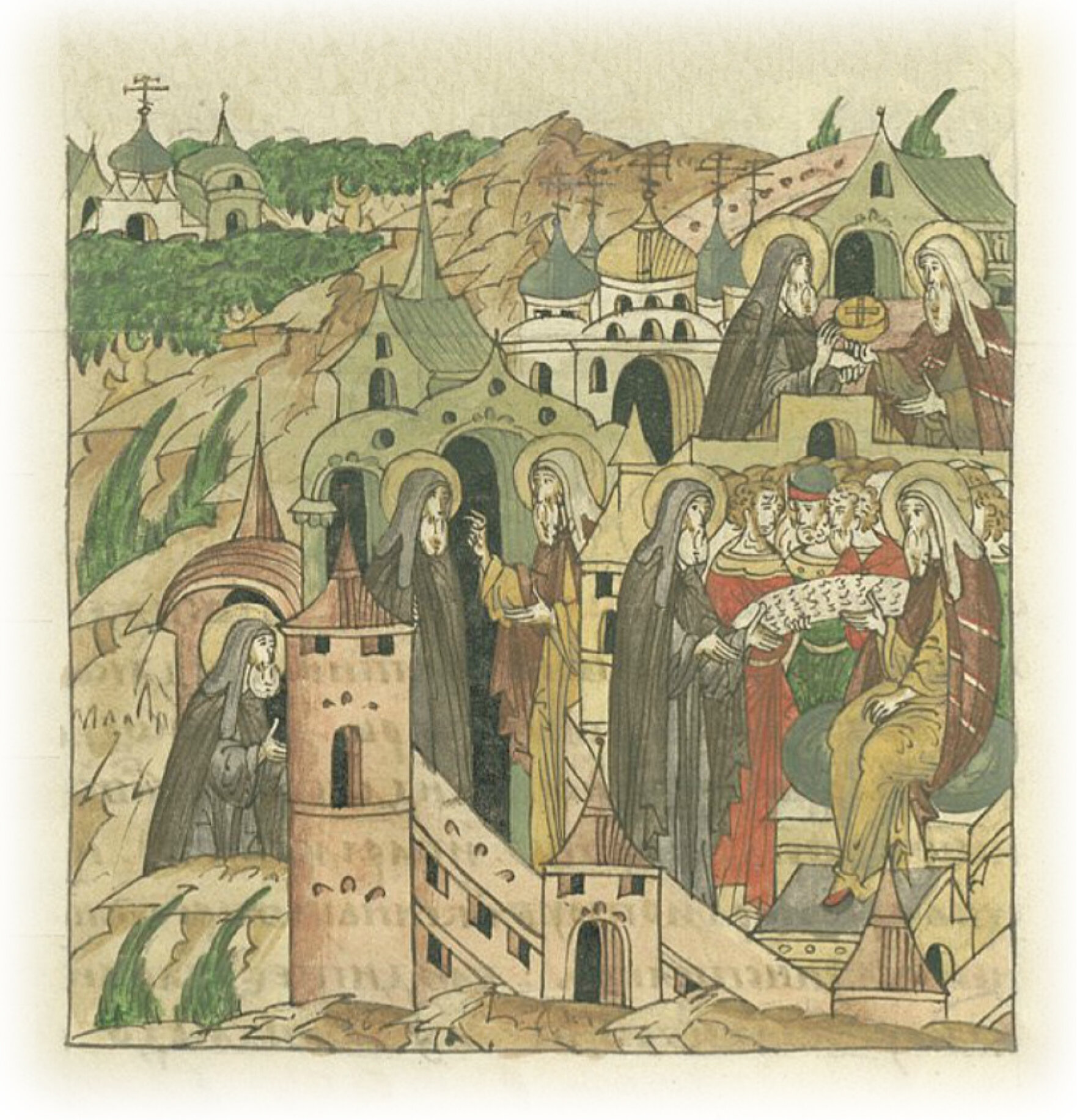 Повесть о преподобном Сергии Радонежском. Митрополит Алексей зачитывает послание Сергию от патриарха Филофея, в котором тот дает благословение сделать в Радонеже общежительный монастырь.