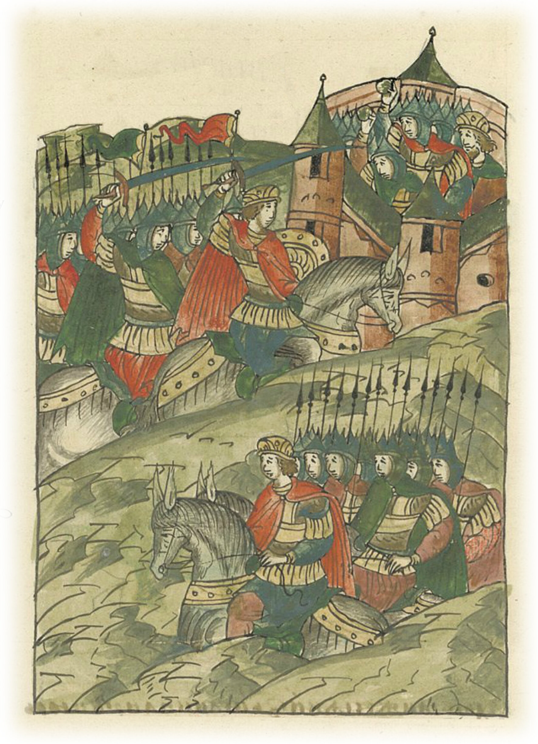 они же пришли к Вышгороду с большим войском и окружили город, и много горожан сражались с ними, и простояли у города девять недель, не успев причинить городу большого ущерба, возвратились восвояси.