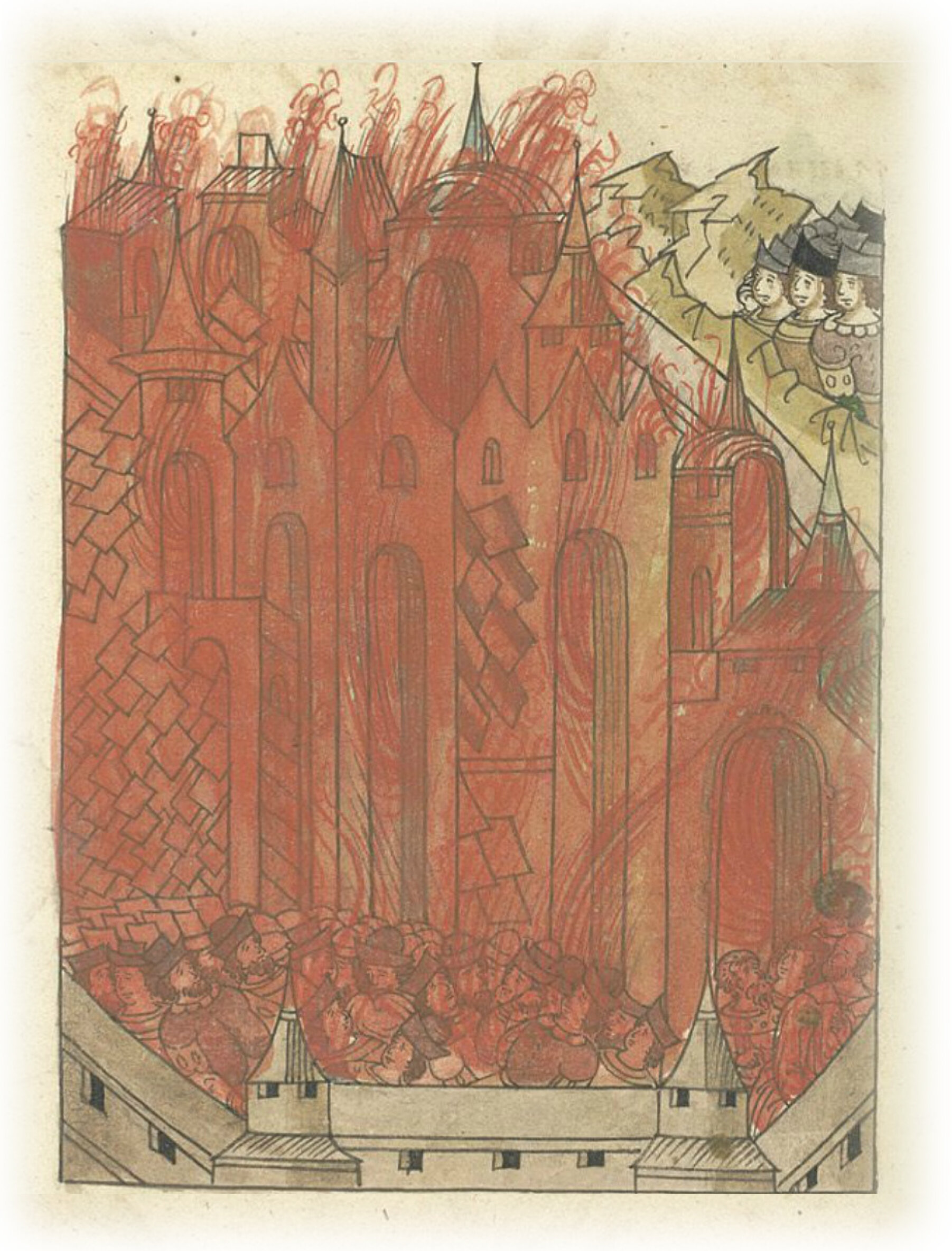 В том же году погорел город Юрьев немецкий весь, и божницы их, сиречь, церкви их, и палаты их рассыпались, и немцев сгорело 2530 (человек), а русских - четыре человека.