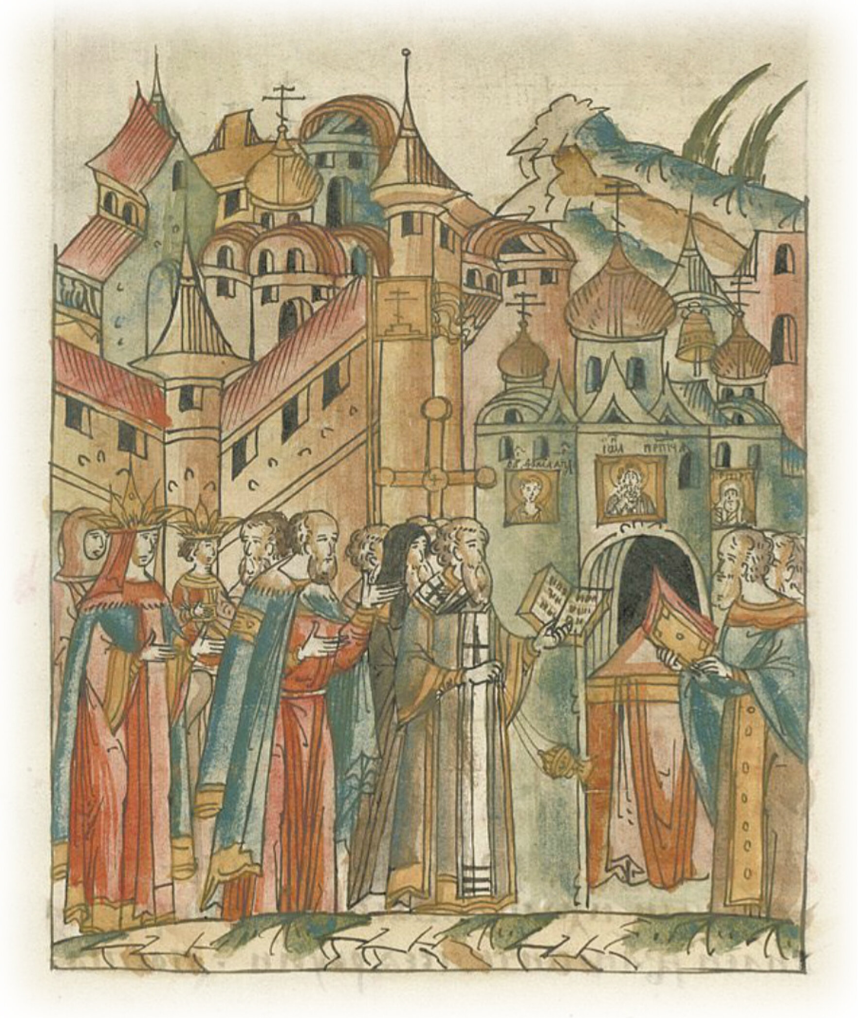 Об освящении. В тот же день она и освящена была. Были же на освящении том великий князь с великой княгиней Еленой и с сыном своим, с князем Иваном, бояре, и множество народа.