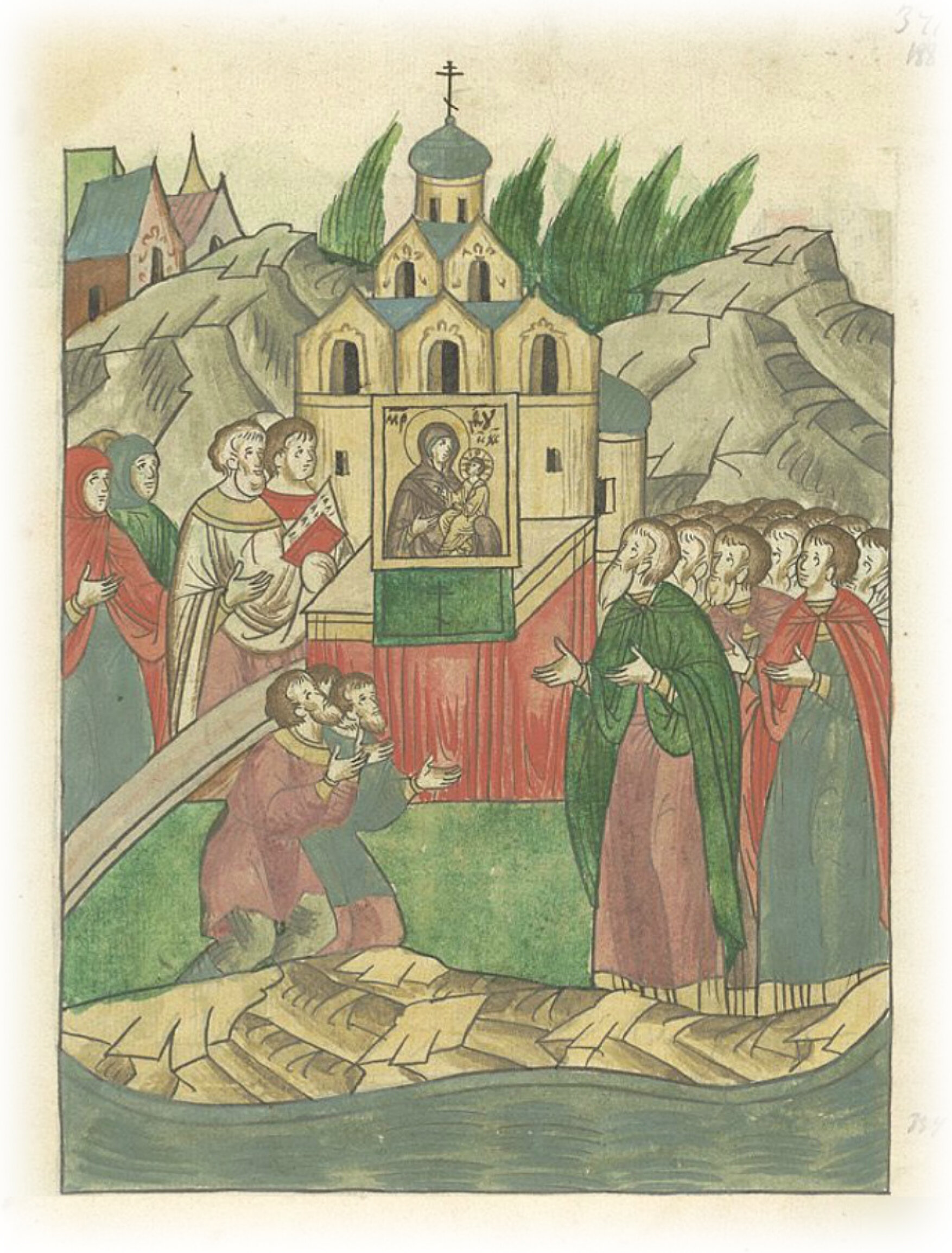 И с тех пор начали бывать у Пречистой Богородицы на Тихвине великие чудеса с верою приходящим, и стояла церковь и образ на том месте семь лет.