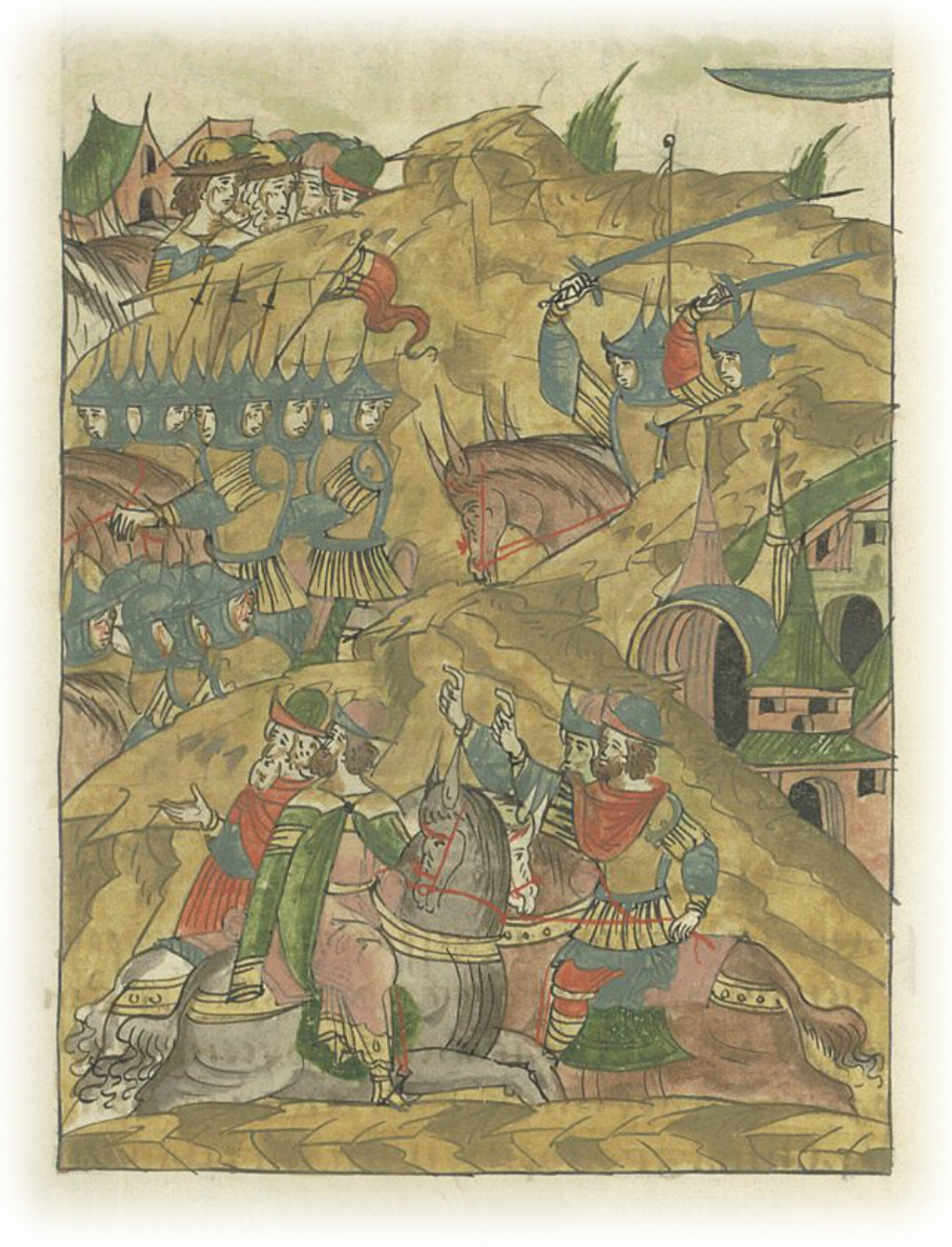 Языки говорят воеводам царя Ивана Васильевича, что магистр окопался большим рвом вокруг города Рындола, бьет из пушек и пищалей и приступает к Рындолу.