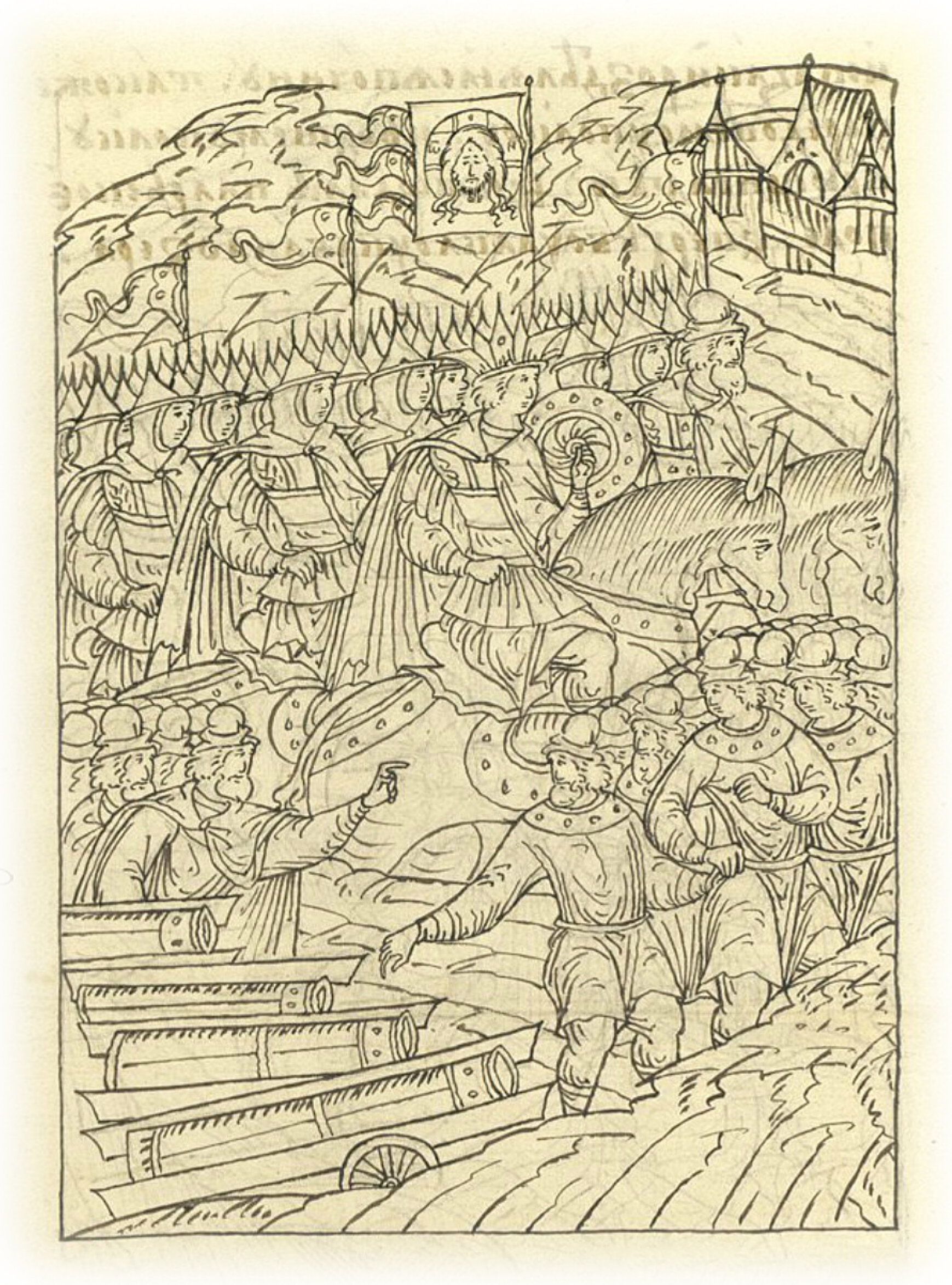 А сам государь пошел за большим полком, а за собою велел идти наряду и сторожевому полку и (полку) левой руки.