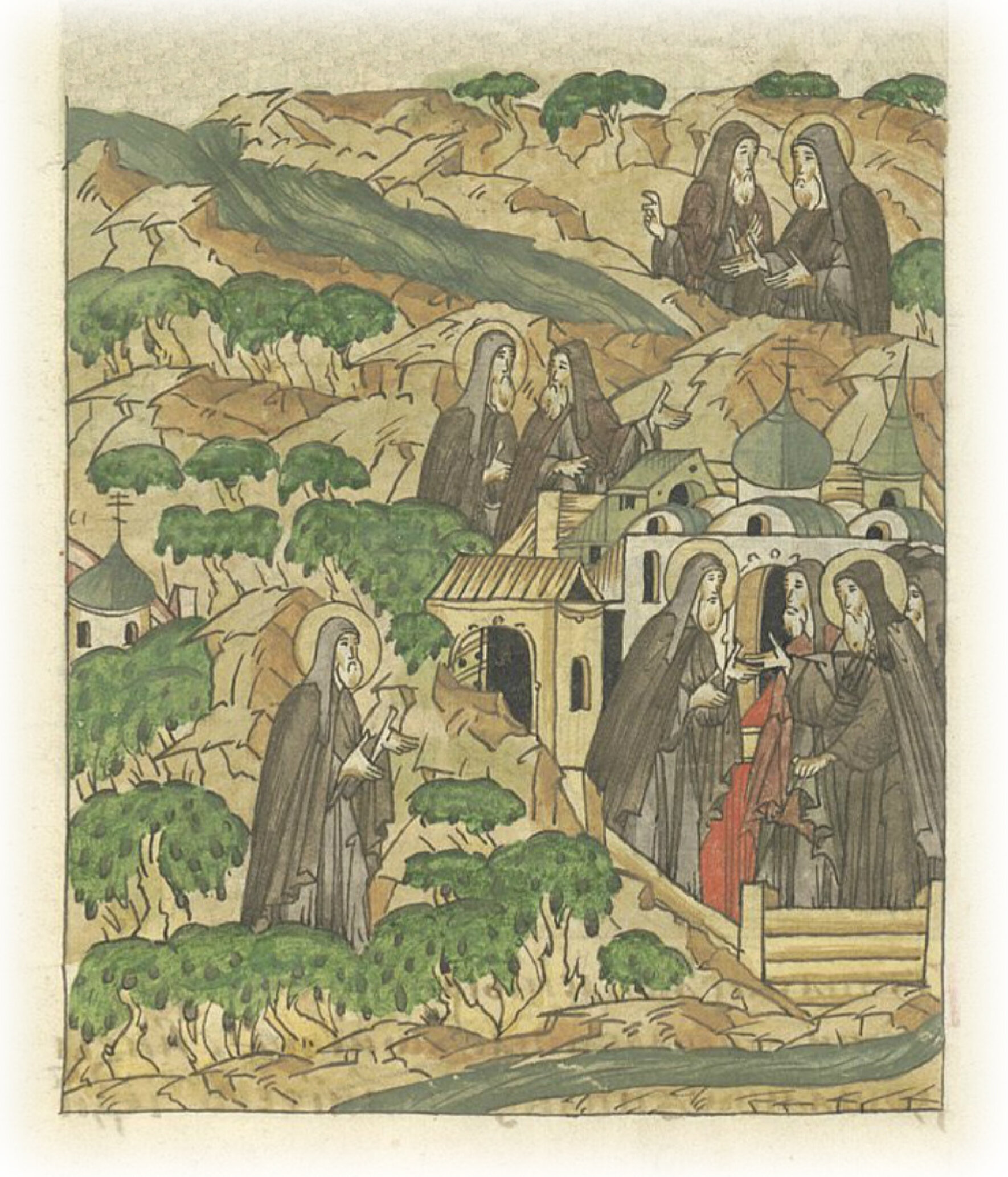 Повесть о преподобном Сергии Радонежском. Преподобный игумен Сергий тайно от своей братии приходит в монастырь на Махрищу-реку к игумену Стефану и просит помочь найти пустынное место. Вскоре он находит место высоко над рекой Кержач.