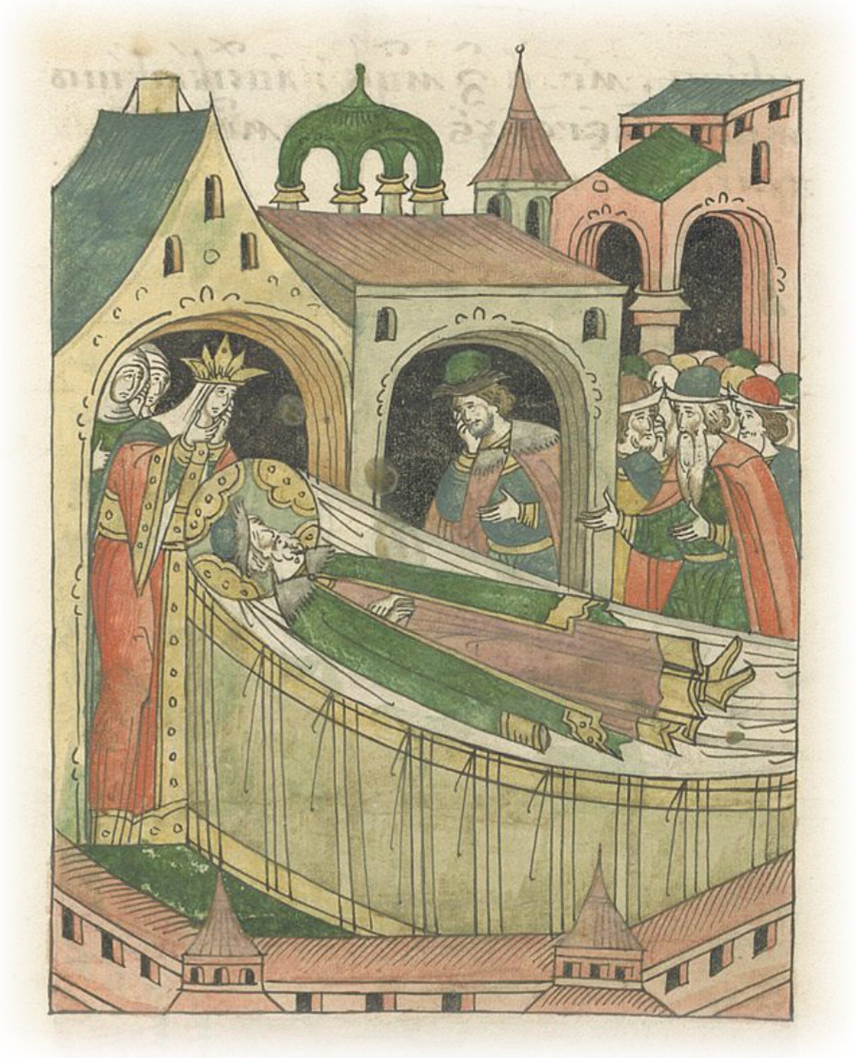 О кончине великого князя Ивана Васильевича всея Руси. В ту же осень (месяца) октября в 27 день, с понедельника на вторник, в 1 часу ночи, скончался благоверный и христолюбивый князь великий Иван Васильевич, государь всея Руси; пробыл он на государстве, на великом княжении после своего отца великого князя Василия Васильевича 43 года и 7 месяцев. А всего ему было 66 лет и 9 месяцев.
