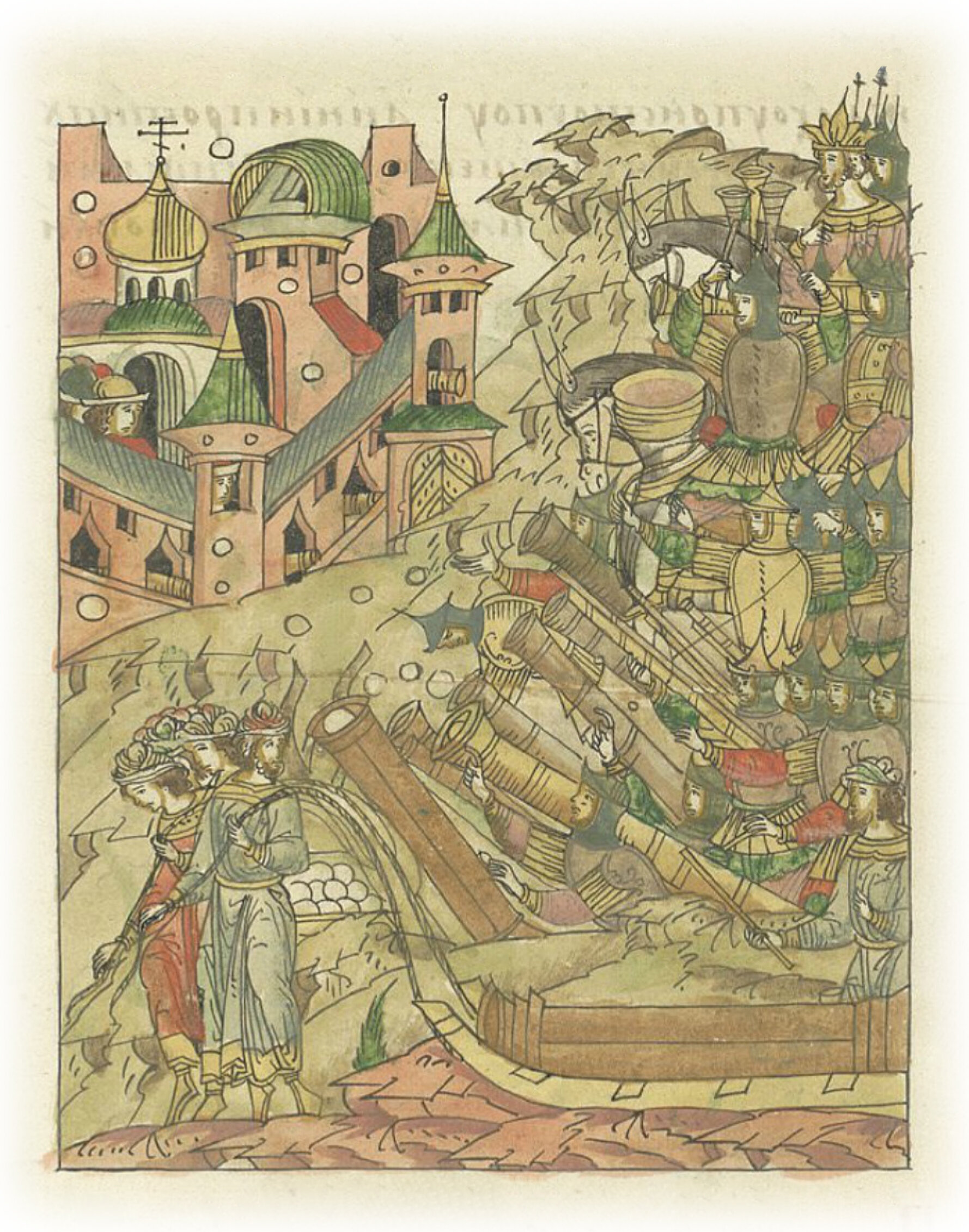 Языки говорят воеводам царя Ивана Васильевича, что магистр окопался большим рвом вокруг города Рындола, бьет из пушек и пищалей и приступает к Рындолу.