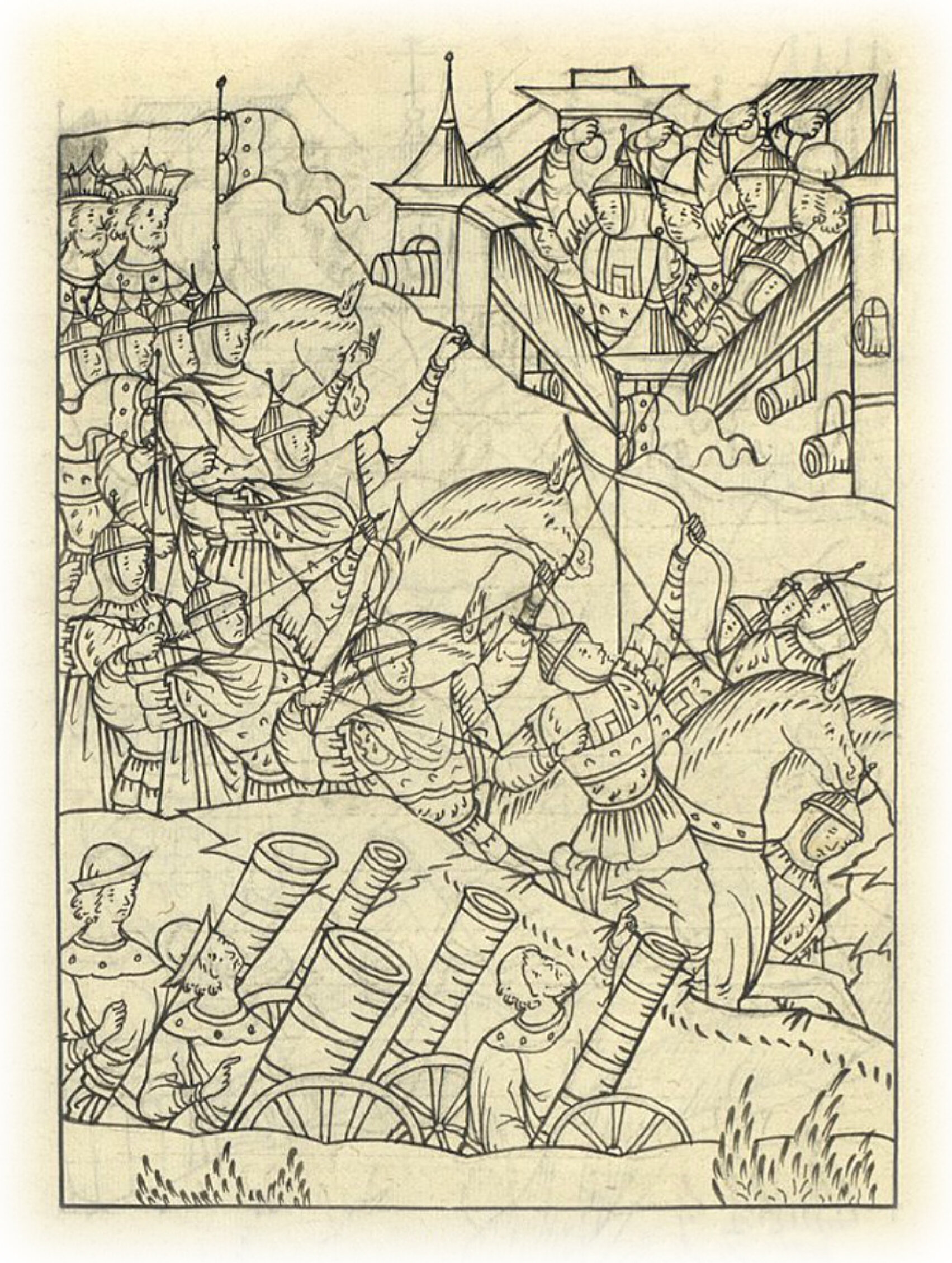 Татары же приступили всеми полками к городу, из пушек и из пищалей начали по городу бить, а стрелы их, как дождь, полетели. И к стенам города приблизились, с города же начали пушками и пищалями татар бить; а которые татары к стене приступили, и тех с города кольем и камнями отбили.