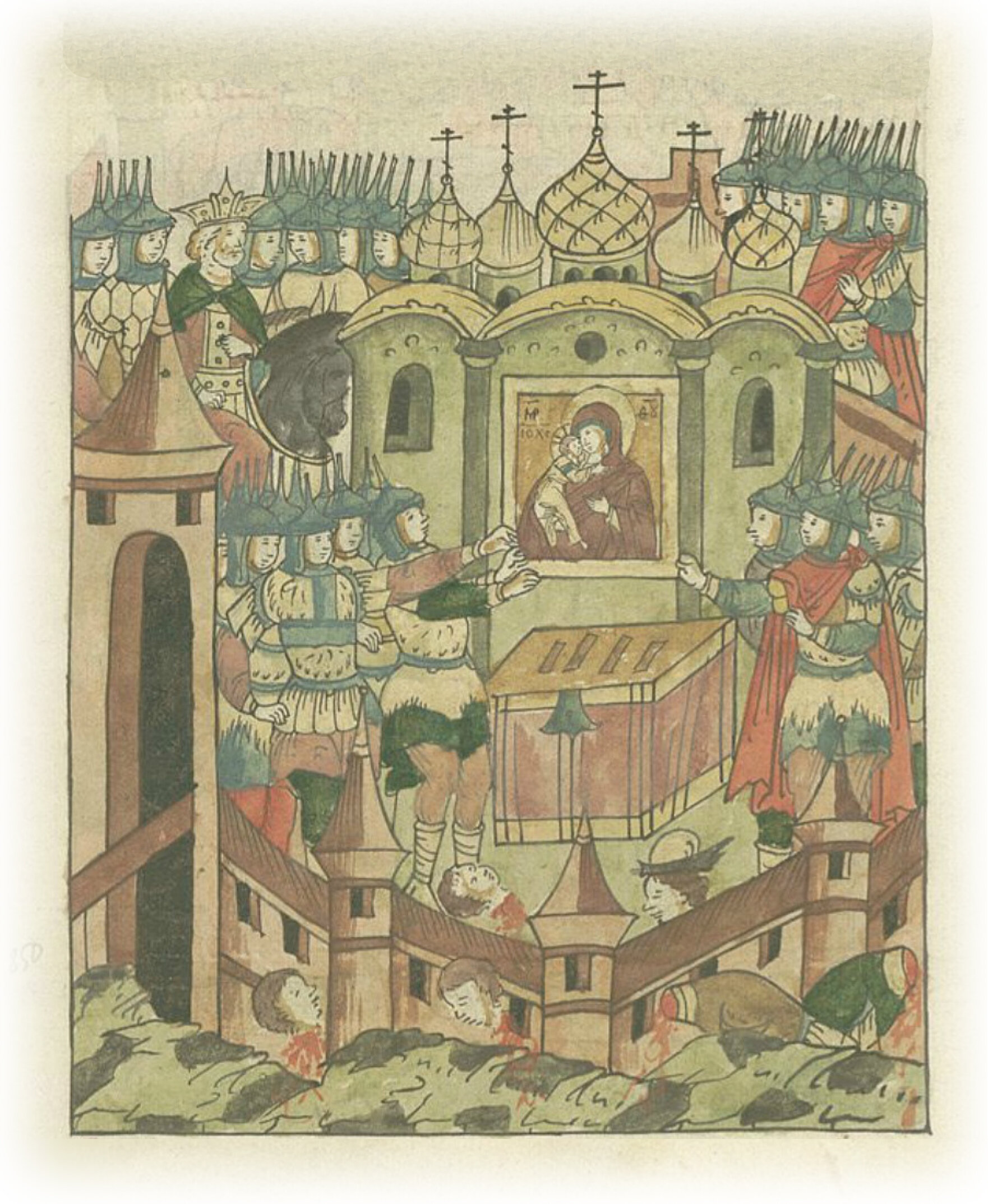 Нашествие Батыя. Татары обдирают драгоценный оклад с чудотворного образа Богоматери. Сам образ остается невридим.