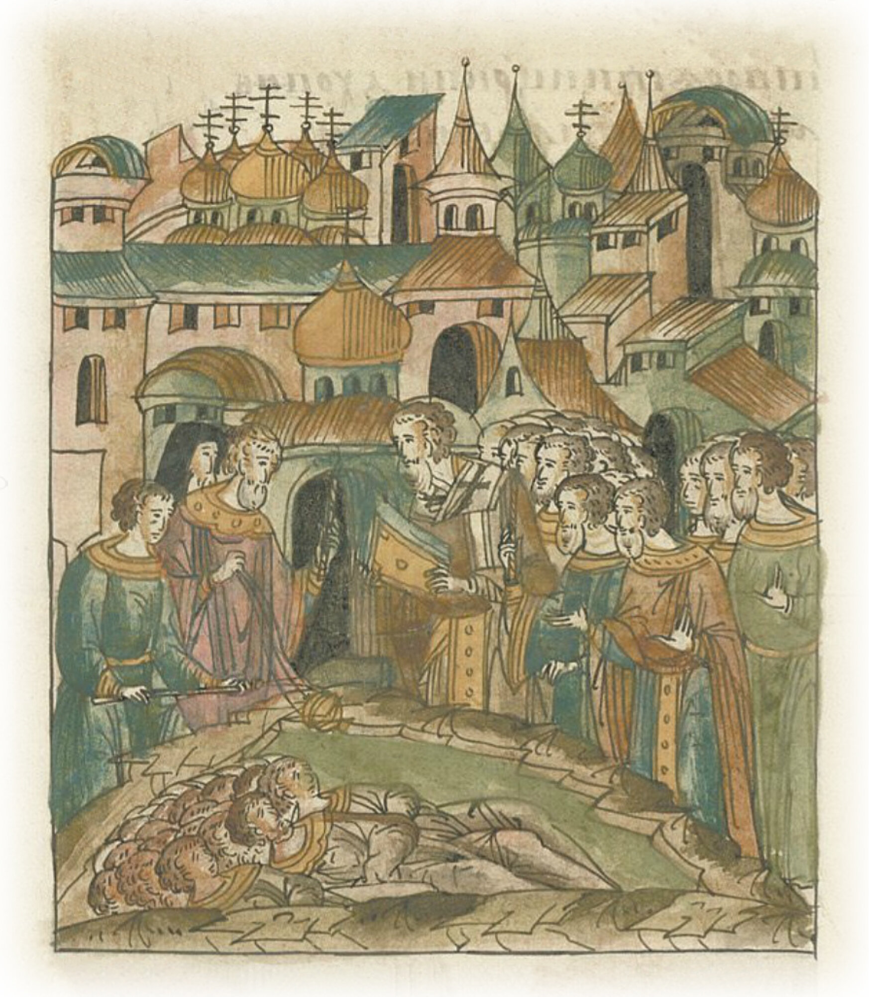 И боголюбивый архиепископ Макарий повелел выкопать ров у церкви святого архангела Гавриила в конце Хренковой улицы, и сам пел надгробное пение, и с ним священники Софийского собора и всего города священники и дьяконы, и погребли их.