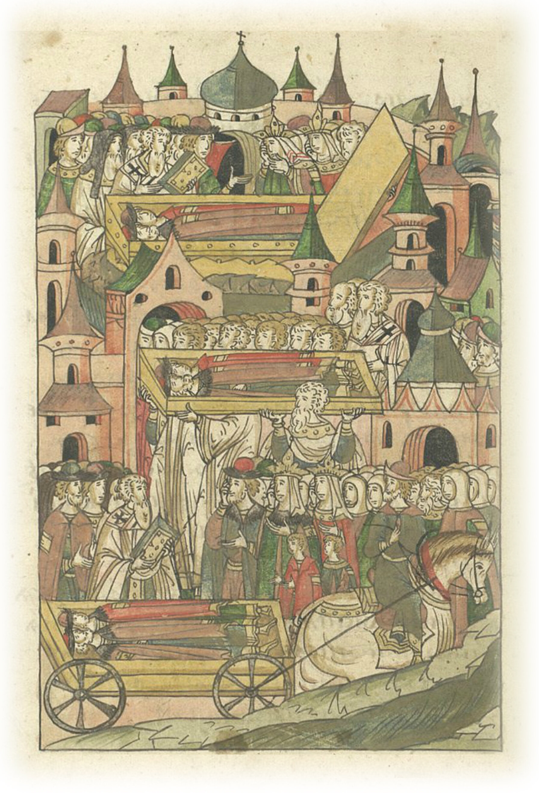 Тела князя Александра Михайловича Тверского и его сына Федора привозят в Тверь и хоронят в церкви Преображения Господа Бога и Спаса нашего Исуса Христа.