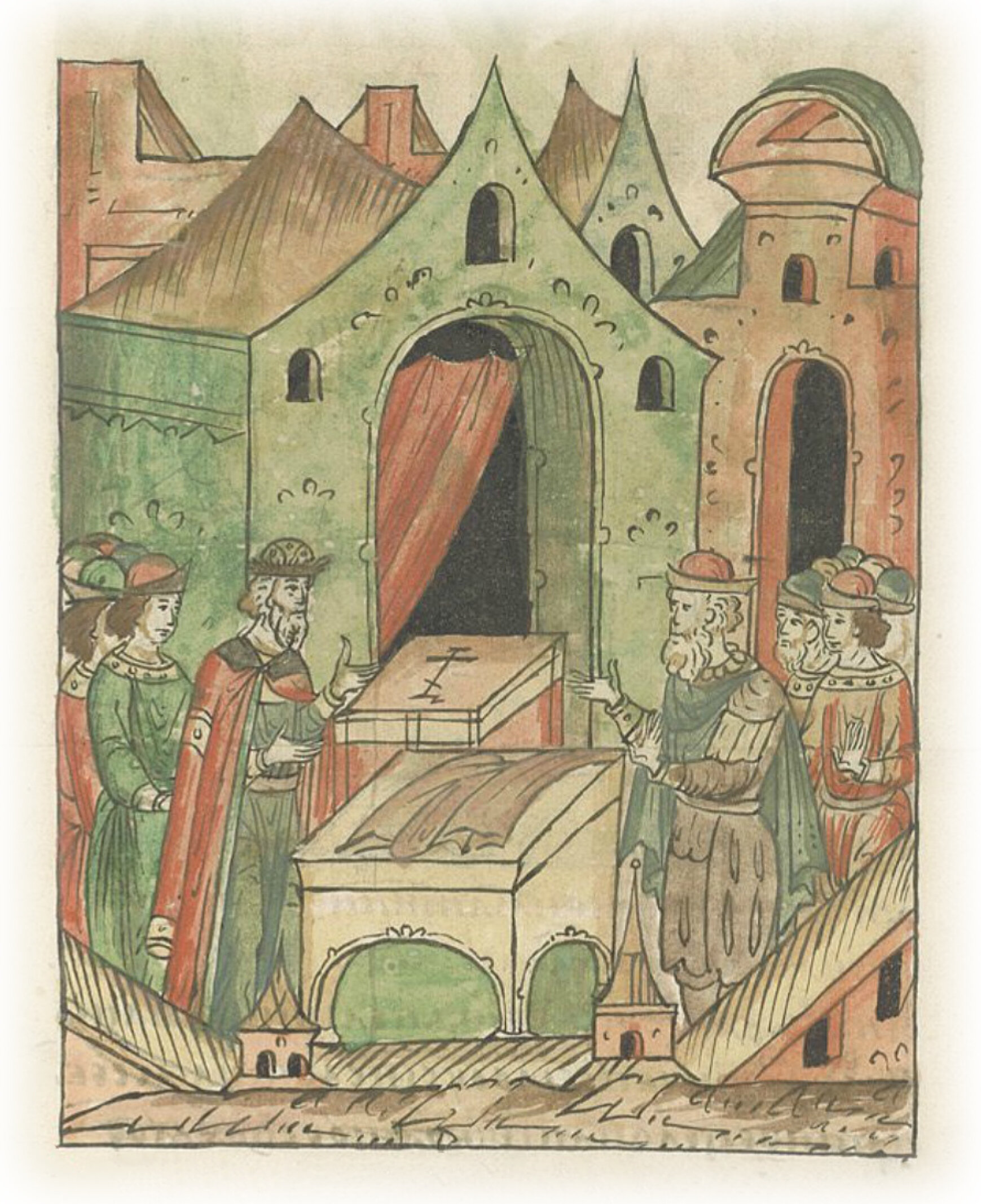 Посол Римского короля Максимилиана приводит великого князя к крестному целованию на договорных грамотах.