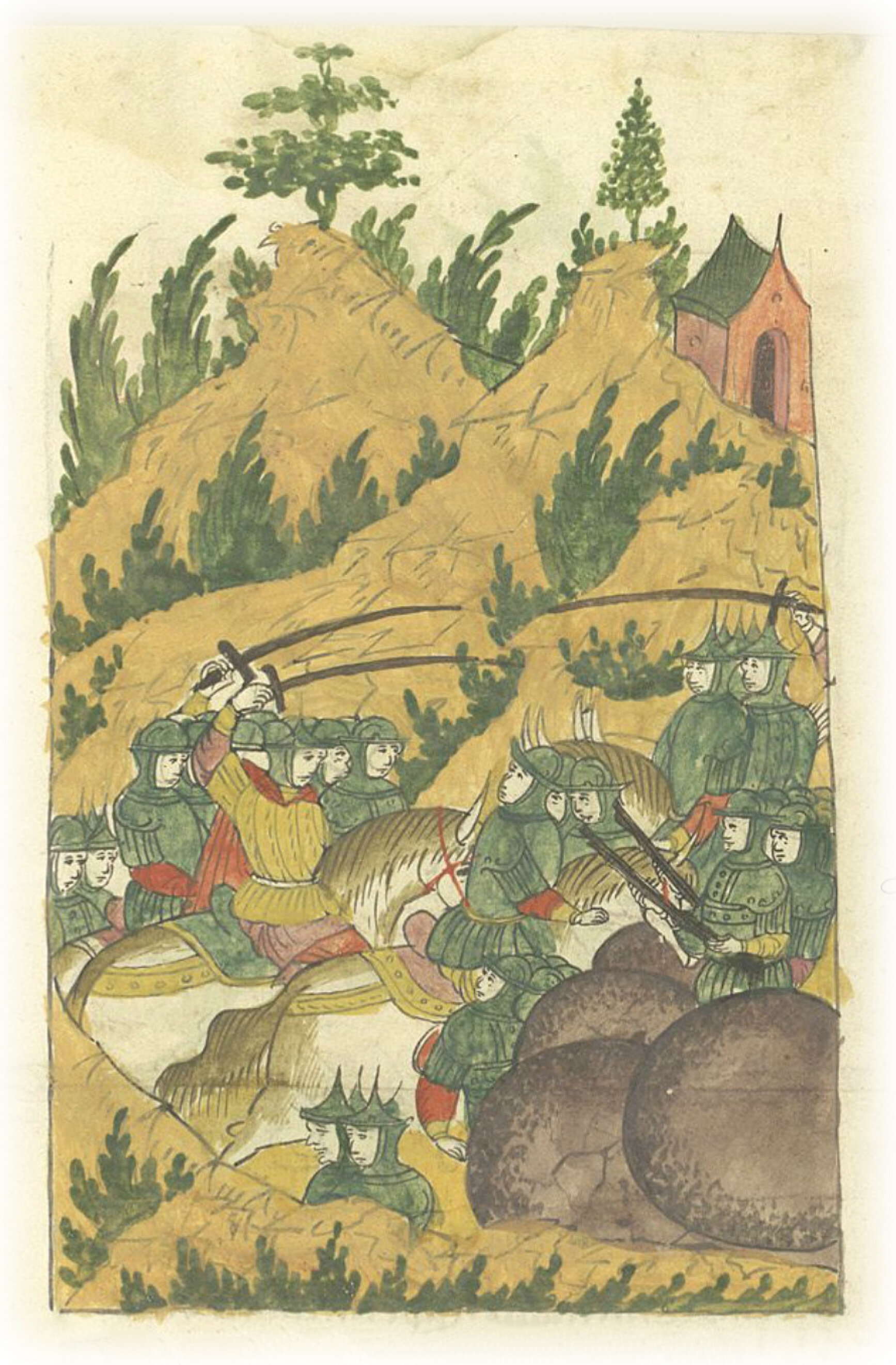 Языки говорят воеводам царя Ивана Васильевича, что магистр окопался большим рвом вокруг города Рындола, бьет из пушек и пищалей и приступает к Рындолу.