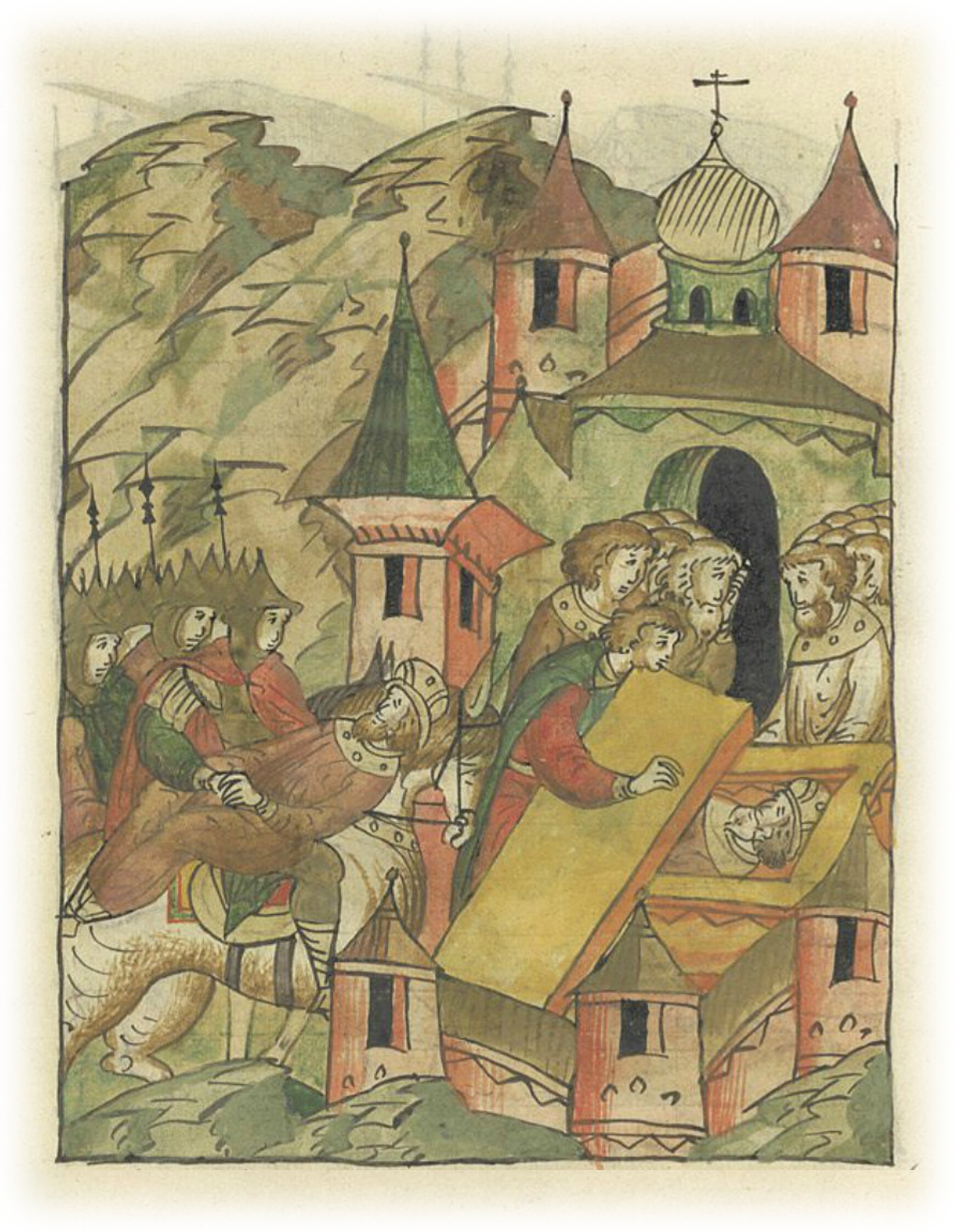 Воины берут тело убитого поляками князя Романа Мстиславича, везут его в Галич и кладут в церкви Пречистой Богородицы.