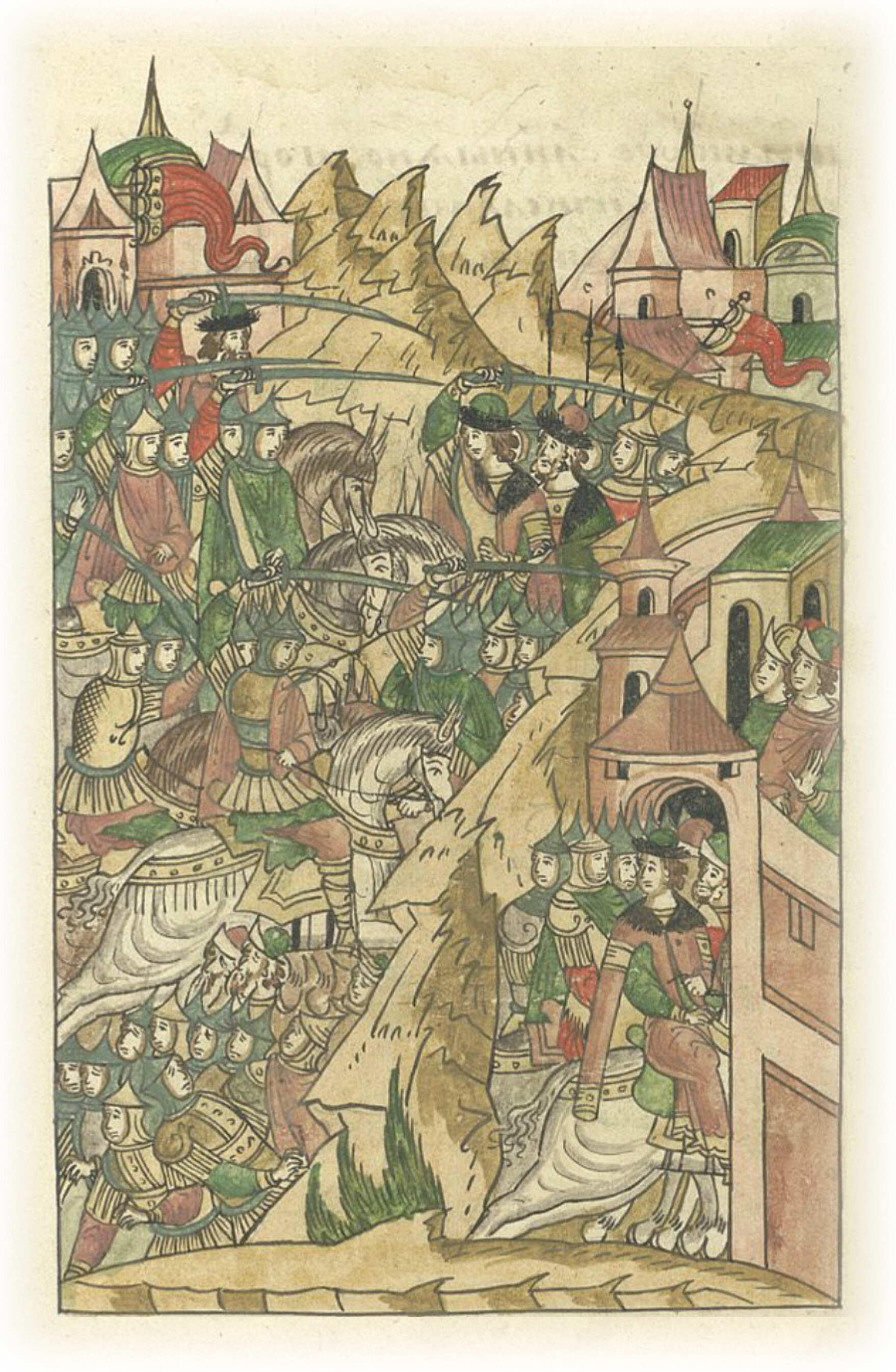 И вышел князь Афанасий Данилович и князь Феодор Ржевский с новогородцами против них, и была битва великая и сеча злая, и побили мужей новгородских: тысяцких, посадников, бояр и прочих знатных много, а иные новгородские силы пали, и числа (им) нет, и едва с немногими оставшимися князь Афанасий Данилович и князь Федор Ржевский убежали в Новгород.