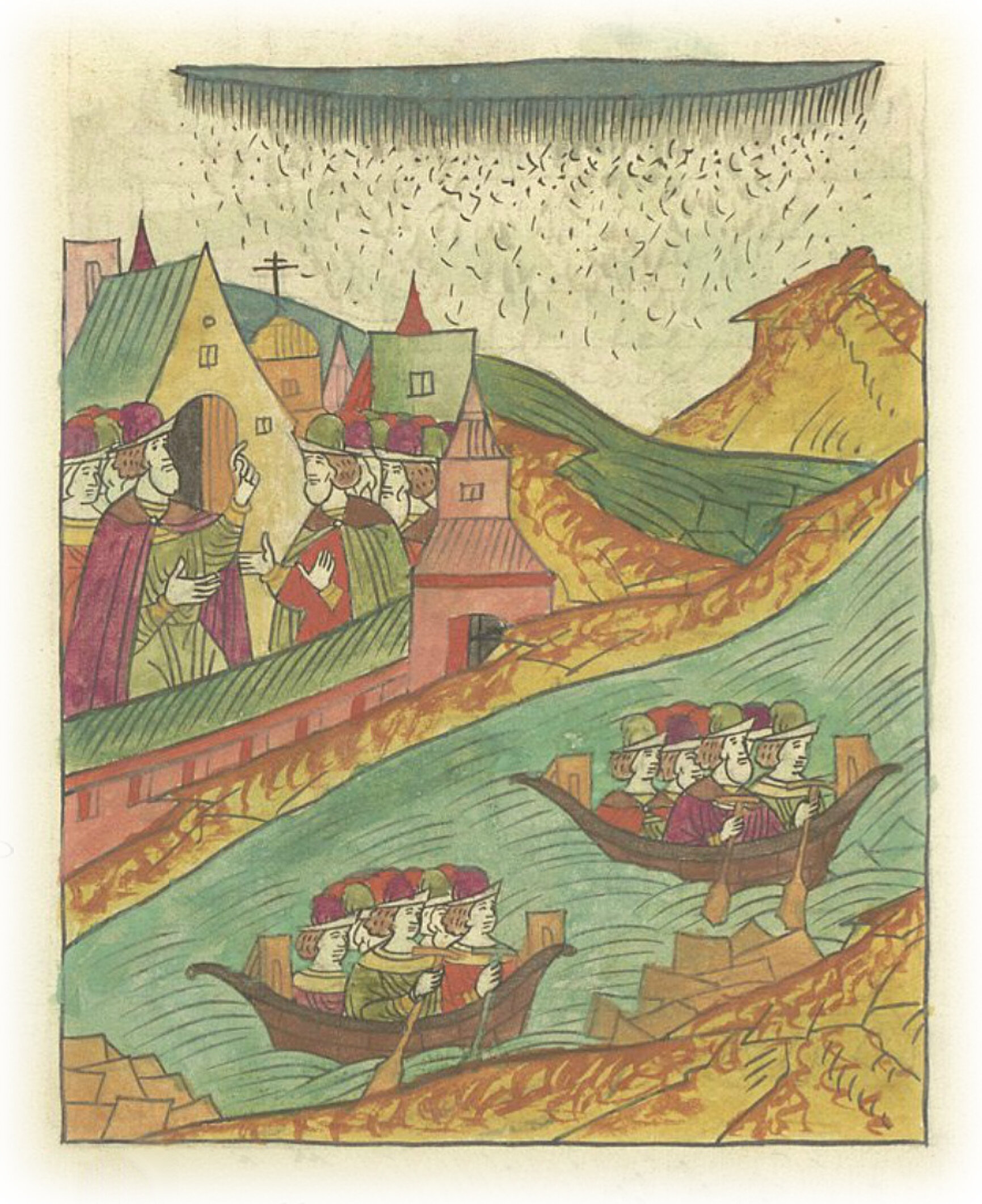 В том же месяце декабре в 9 день были дожди большие и половодье великое, реку померзшую взломало, и лед прошел, и стояло половодье две недели: по рекам в судах ездили до Рождества Христова.