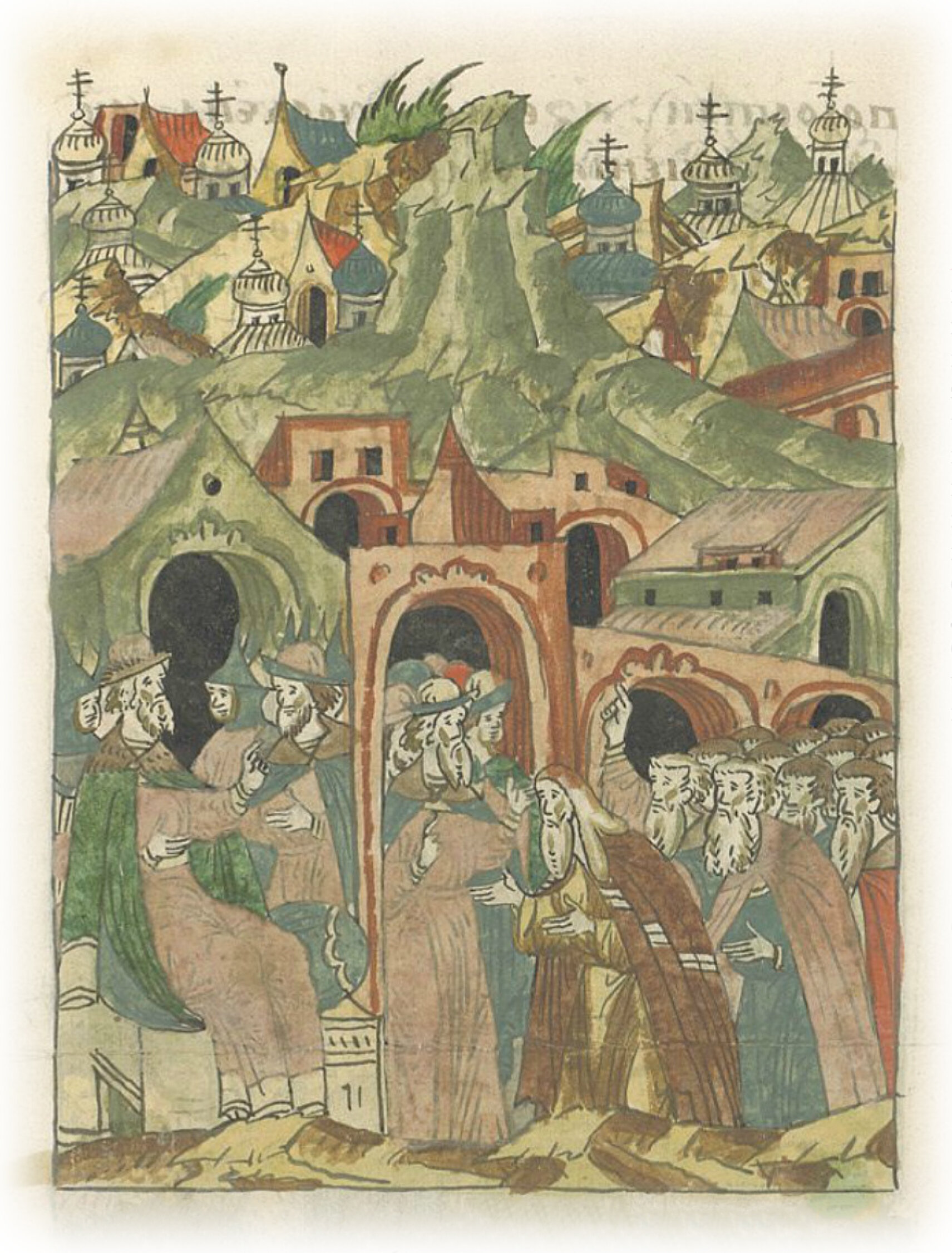Января (месяца) в 6 день, на Крещение, во вторник, пришел к великому князю владыка с посадниками и с зажиточными горожанами, с челобитьем и с половиною волостей владычных, да новоторжские все волости – владычные, и монастырские, и боярские, – чьи бы не были, от всех отступились для великого князя; да били челом о монастырях, чтобы пожаловал, у шести монастырей взял половину волостей и земель: у Юрьева, у Благовещенского Богородицкого, у Аркадьевского Богородицкого монастыря, у Антониева, у Никольского Неревского конца, у Никольского на Сковородке; а иные бы монастыри государь пожаловал, земель у них не брал, потому что они убоги, земель у них мало.