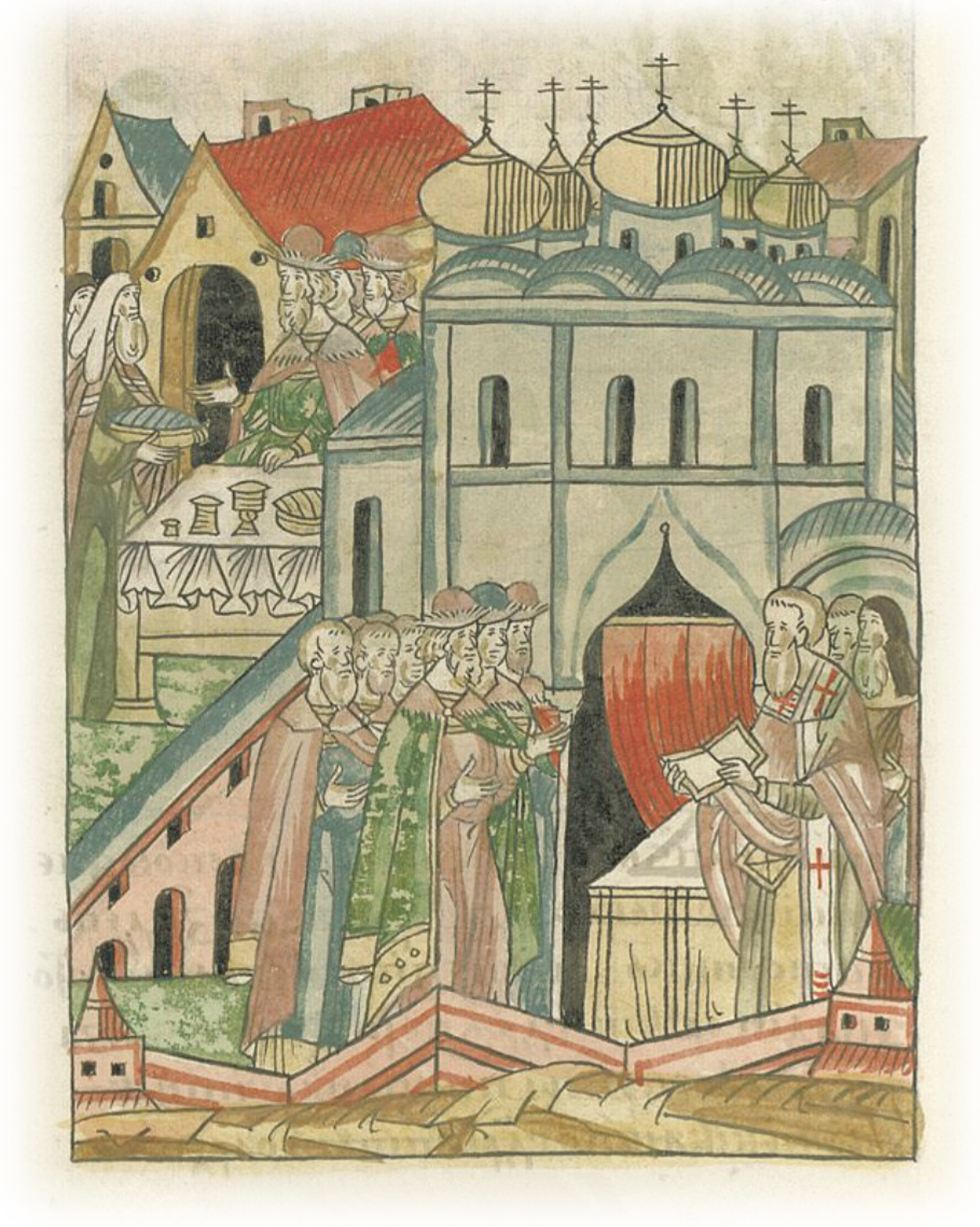 Великий князь Иван Васильевич слушает обедню и молебен в церкви Софии Премудрости Божьей и обедает у архиепископа Геннадия.