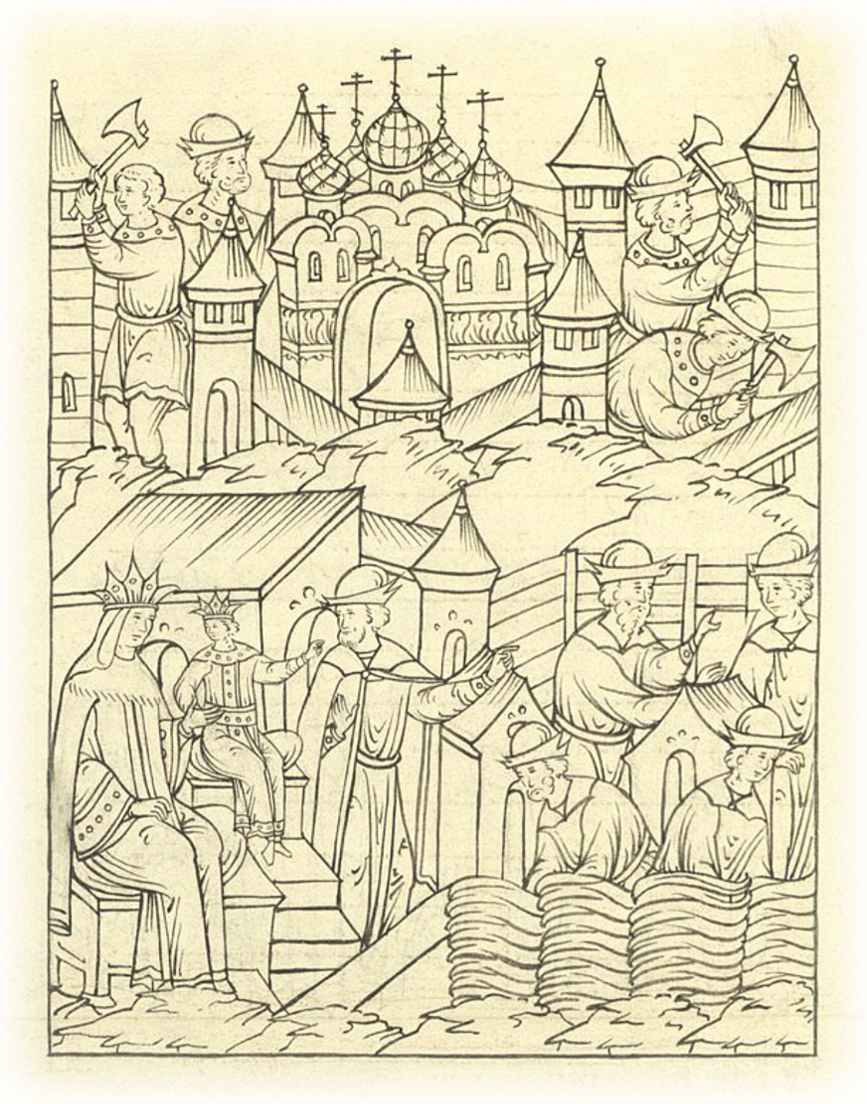 Постройка деревянного города в Новгороде Великом на Софийской стороне. Строительство в Москве земляного города.