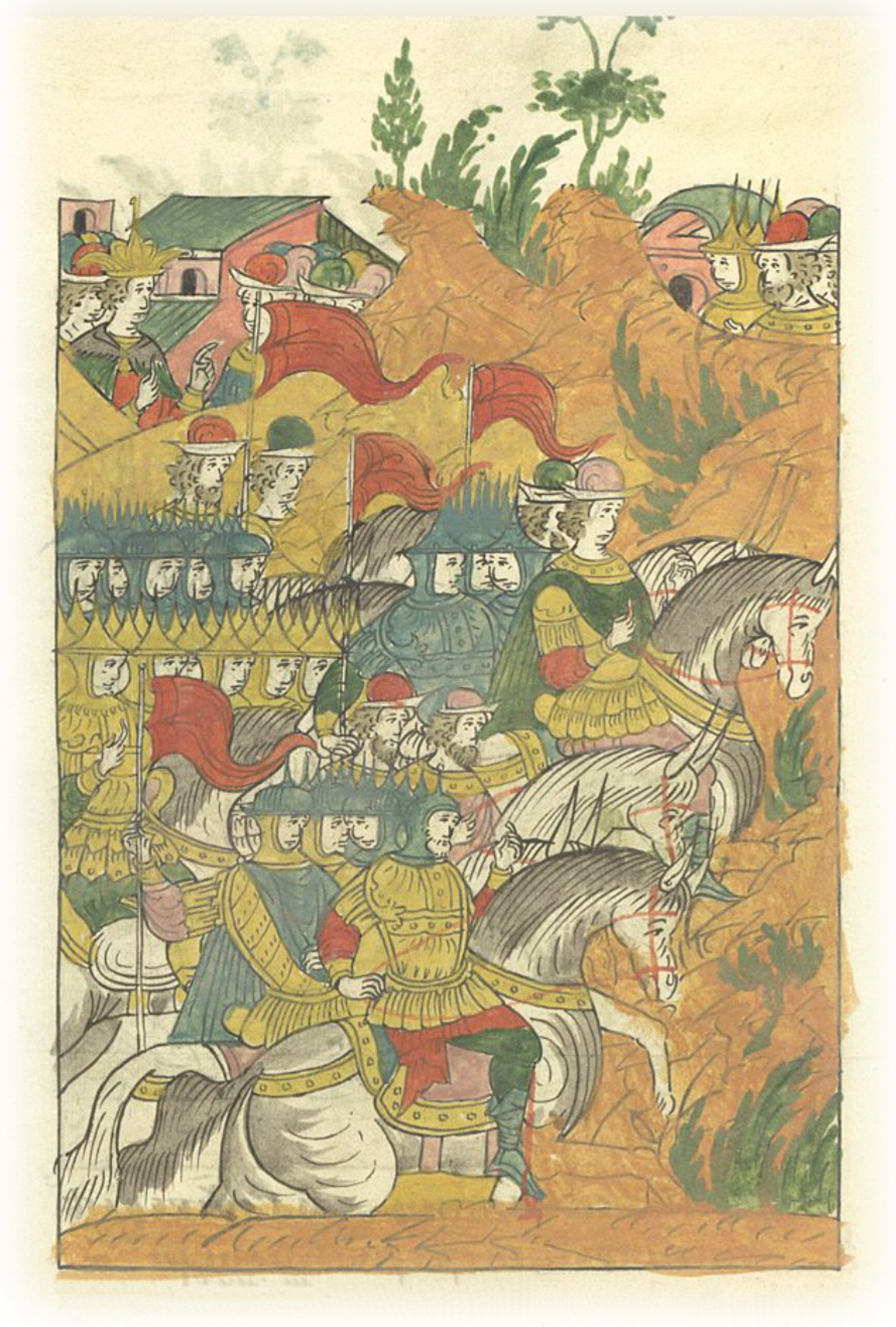 И государь на них рать свою большую послал: в большом полку – боярина и воеводу князя Ивана Федоровича Мстиславского да боярина Данила Романовича, в передовом полку – боярина и воеводу Захария Петровича, да воеводу Михаила Вороного, в сторожевом полку – боярина и воеводу Михаила Яковлевича Морозова да князя Василия Ситцкого; да с князем же Иваном Федоровичем воевода для посылок Иван Петрович Яковлев, в передовом – Иван Меньшой Васильев, сын Шереметева, в сторожевом – князь Василий Токмаков.