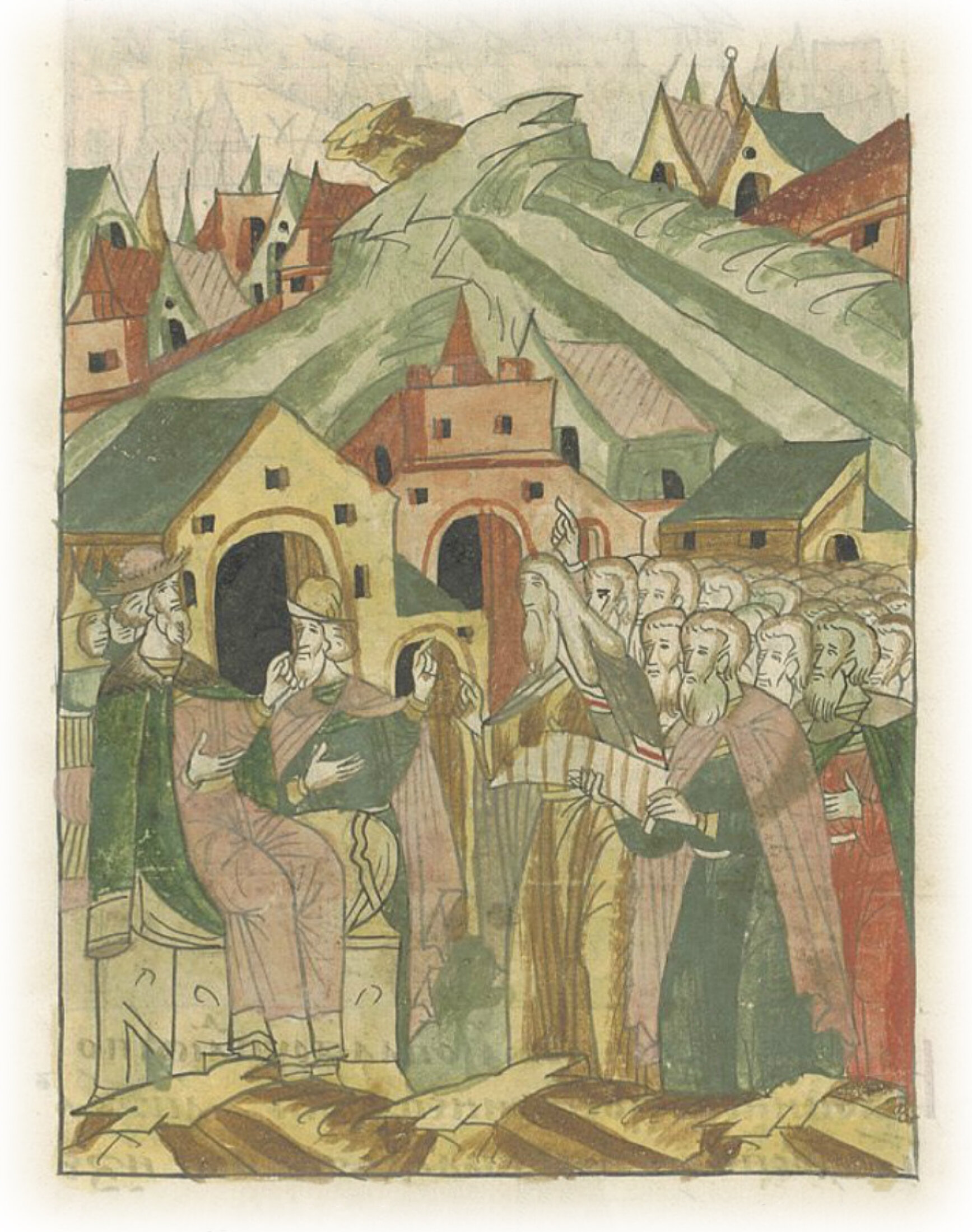 Новгородский владыка Феофил, посадники и зажиточные горожане приносят великому князю список на половину владычных и монастырских волостей.