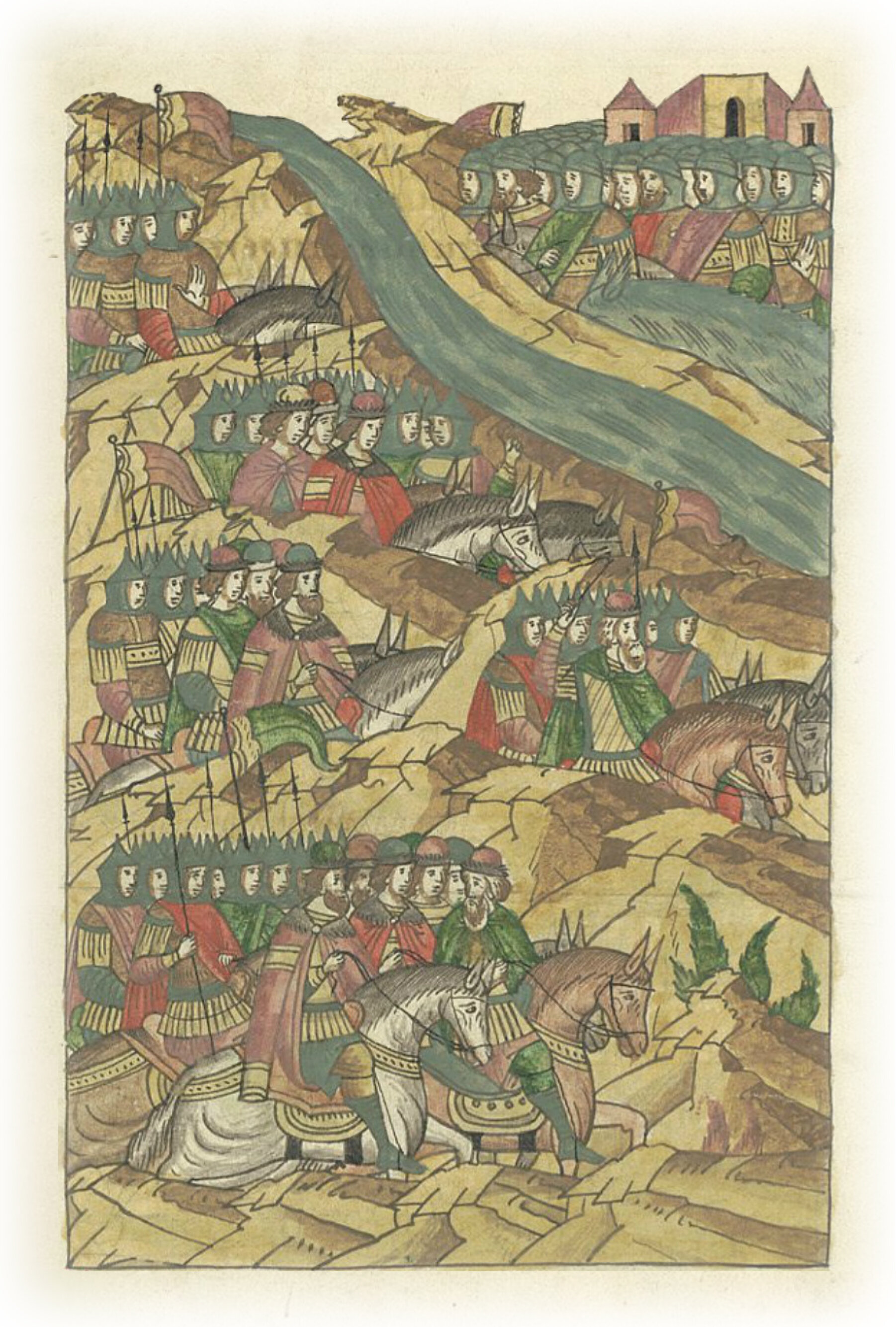 И пошли к Раковору; и когда пришли на реку Кигору, встретили их там полки немецкие во множестве сил, словно песок, ибо вся земля Немецкая собралась. И начали князья полки снаряжать: новогородская сила (прямо) лицом к немцам, против великой железной свиньи, а князь Довмонт со псковичами на правой руке, а князь Дмитрий Александрович и князь Святослав Ярославич Ярославичев повыше правой руки, а князь Михайло Ярославич Ярославичев на левой руке с иными князьями. И была (такова) сила великая русских князей, что и исчислить нельзя.