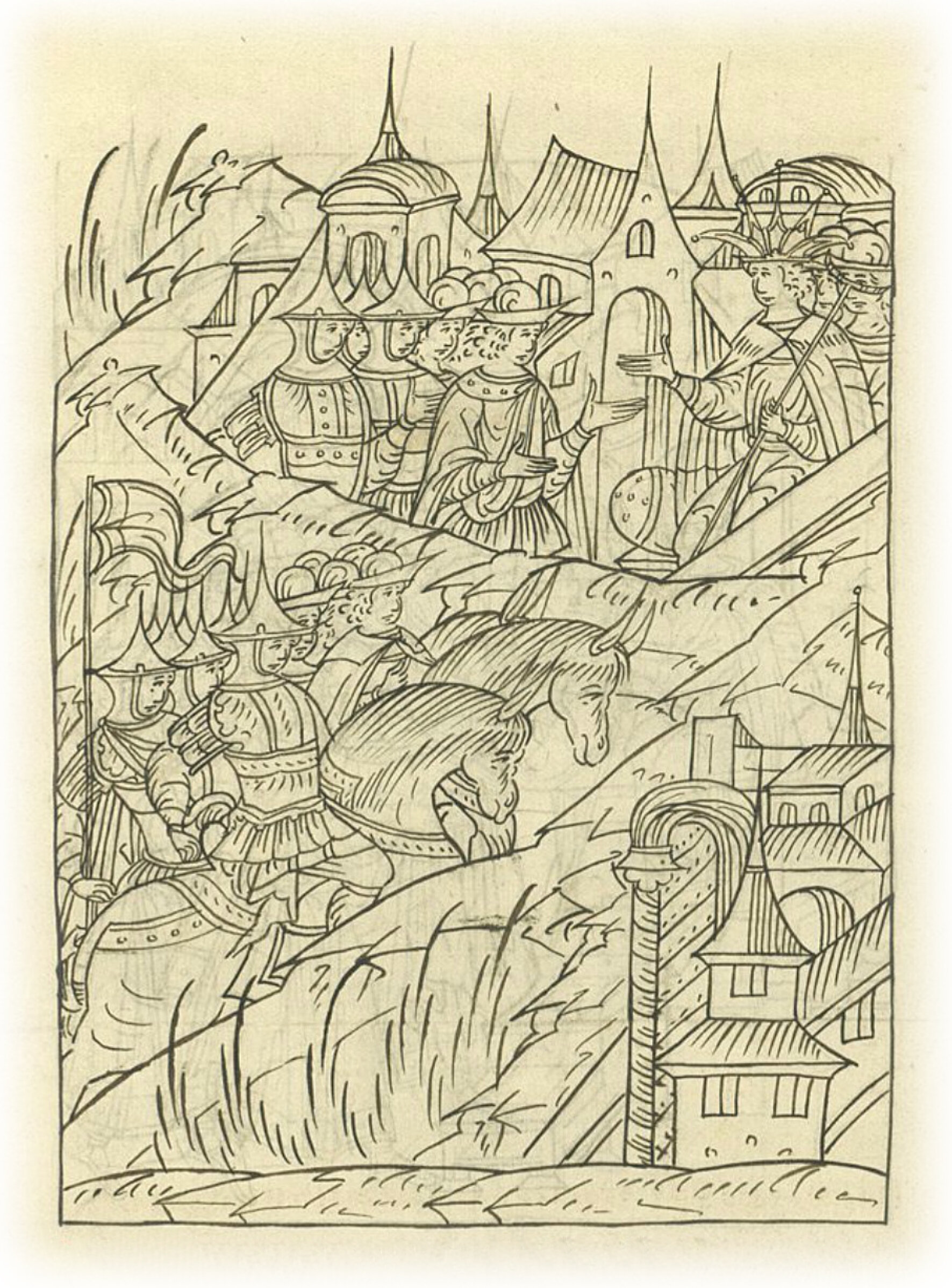 Языки говорят воеводам царя Ивана Васильевича, что магистр окопался большим рвом вокруг города Рындола, бьет из пушек и пищалей и приступает к Рындолу.