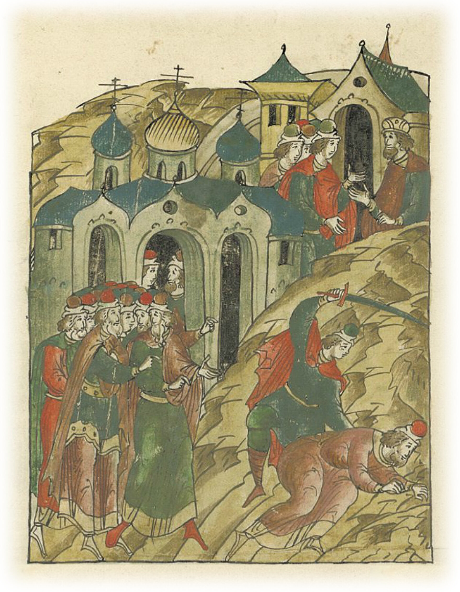 Убийство великого князя Андрея Юрьевича Боголюбского во Владимире Кучковичами. В том же году был убит великий князь Андрей Боголюбский. Вот как произошло его убийство: в пятницу на обедне совет держали окаянные убийцы. Был у князя любимый слуга по имени Яким Кучкович, который услышал, что повелел князь Андрей его брата, схватив, казнить, так как тот совершил некий проступок,