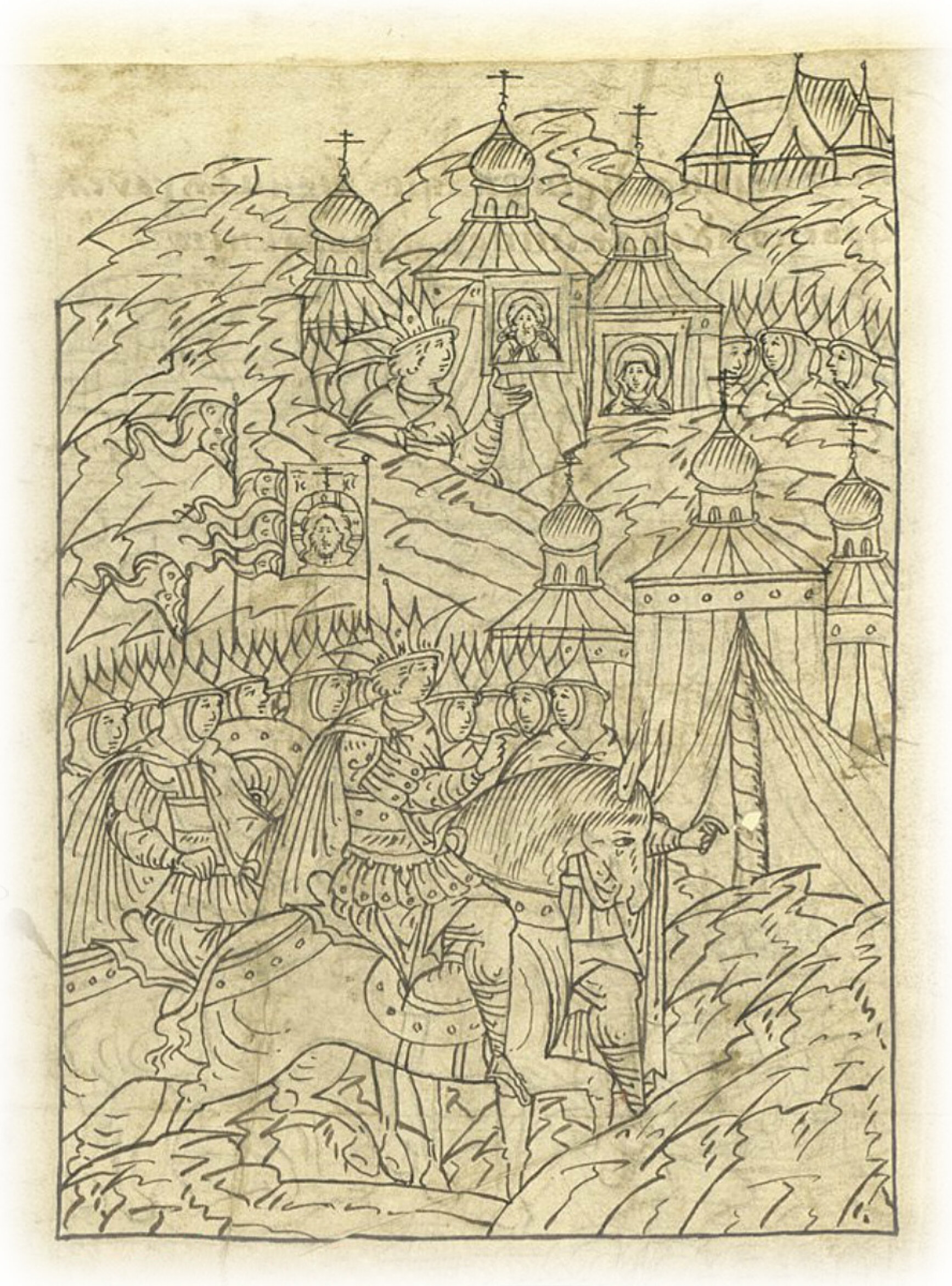 И повелел церкви поставить полотняные: (во имя) архистратига Михаила, вторую – (во имя) Екатерины, Христовой мученицы, третью – (во имя) преподобного отца Сергия чудотворца, к которому каждый день государь ходил;