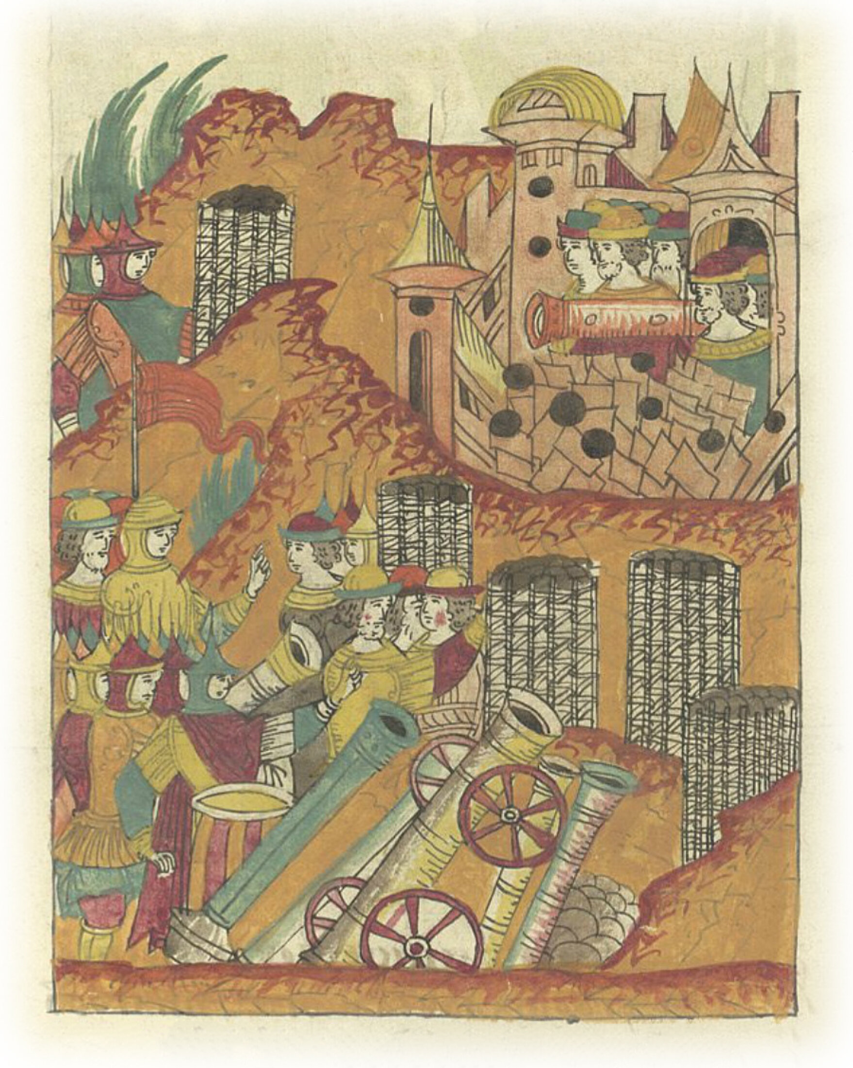Взятие Новгородка (Нейгаузена). Воеводы велят стрелецким головам Тимофею Тетерину и Андрею Кашкарову поставить около города туры и подвинуть пушки, которыми затем сбивают стрельню и разбивают много домов.