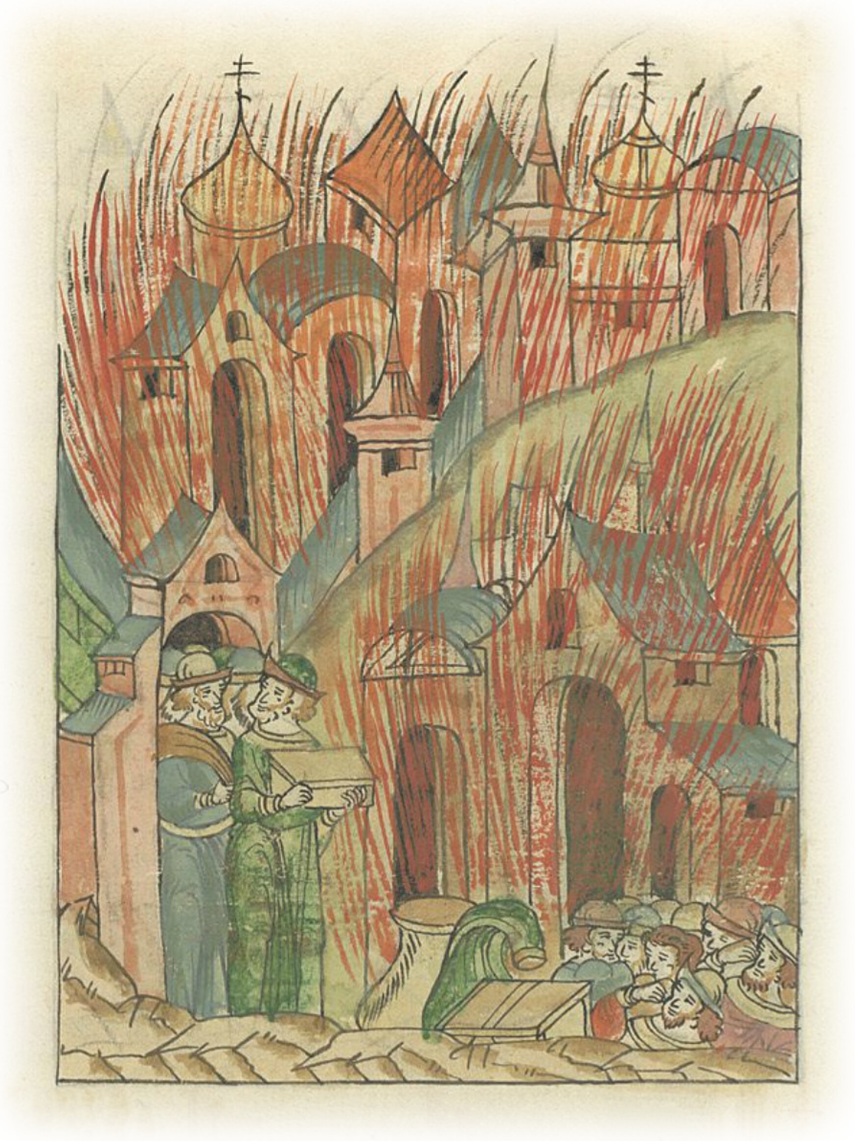 И потом в том же месяце был пожар в Новгороде, сгорело заполье* Микитиной улицы, и постигло несчастье многих людей: те, которые спаслись от первого пожара со своим имуществом, сейчас все погорели со своим имуществом; и большая скорбь охватила христианство. * нетягловое отдаленное поле в перелесках на неудобных для пахоты местах, за основными пахотными землями, превращавшиеся иногда в сенокосное угодье.