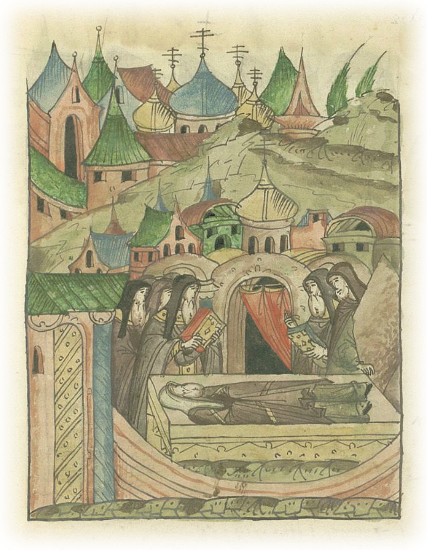 Кончина Новгородского владыки Иоанна и его похороны в притворе монастыря святого Воскресения на Деревянице.