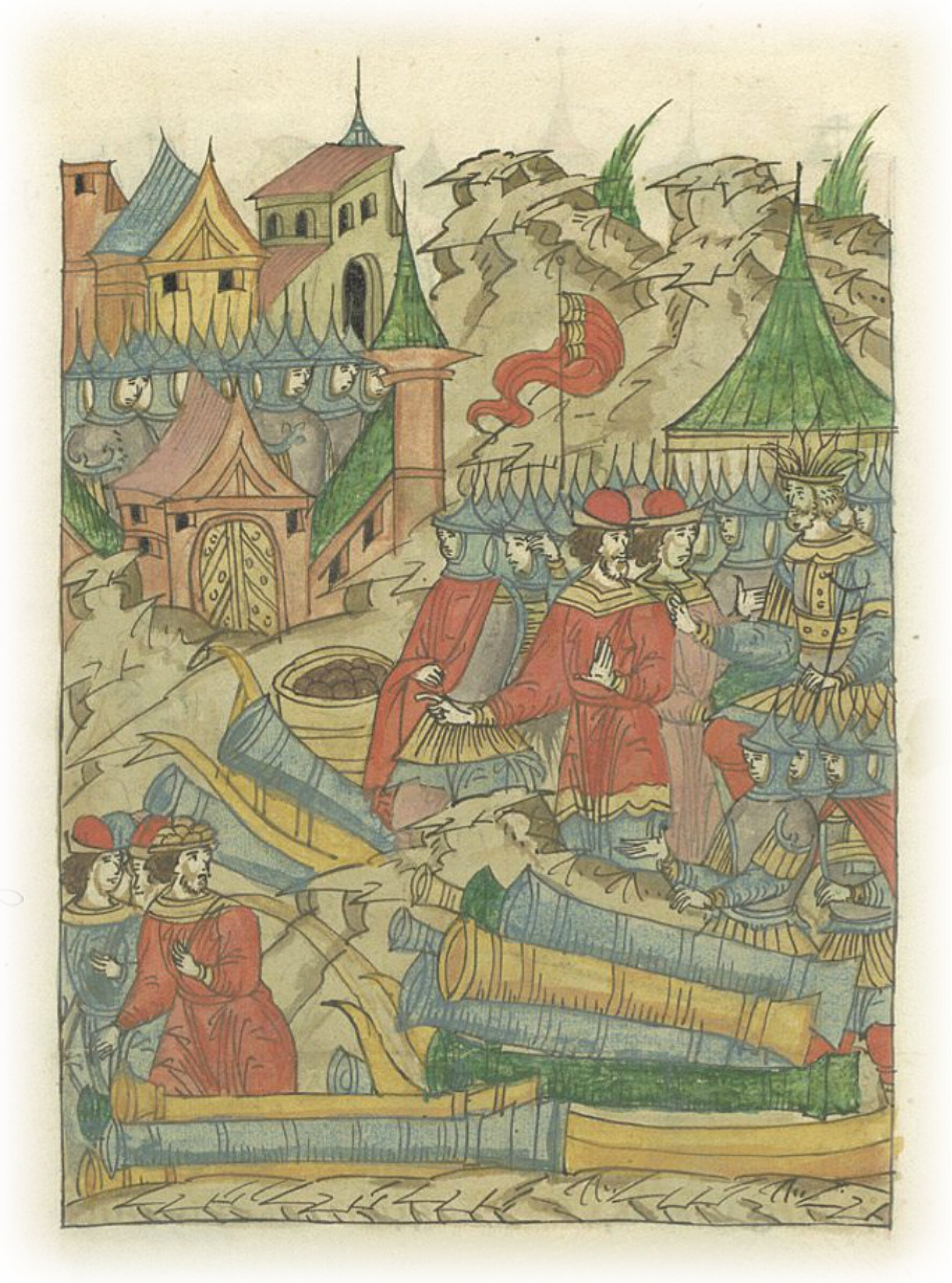 Увидел безбожный Магмет, что не добился ничего, но только своих погубил и повелел магистрам вскоре прибавить многие пушки и пищали и готовить стенобитные орудия; и только на седьмой день неверный повелел идти войску к городу и биться так, как и вначале, без отдыха.