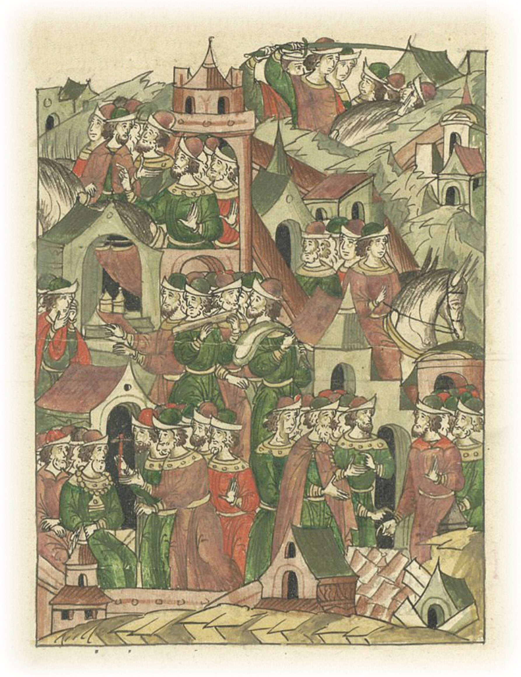 Но новоторжцы испугались, и чернь восстала против бояр, говоря: «Зачем призвали новгородцев, а они наместников великого князя поймали? За это погибнем мы все». И чернь, собравшись, пошла на дворы их, и освободили от оков наместников великого князя Семена и, отпустив, проводили их из Торжка. А новгородские бояре убежали в Новгород. А (чернь) имения новоторжских бояр разграбила, и дома их разорила, и села их опустошила.