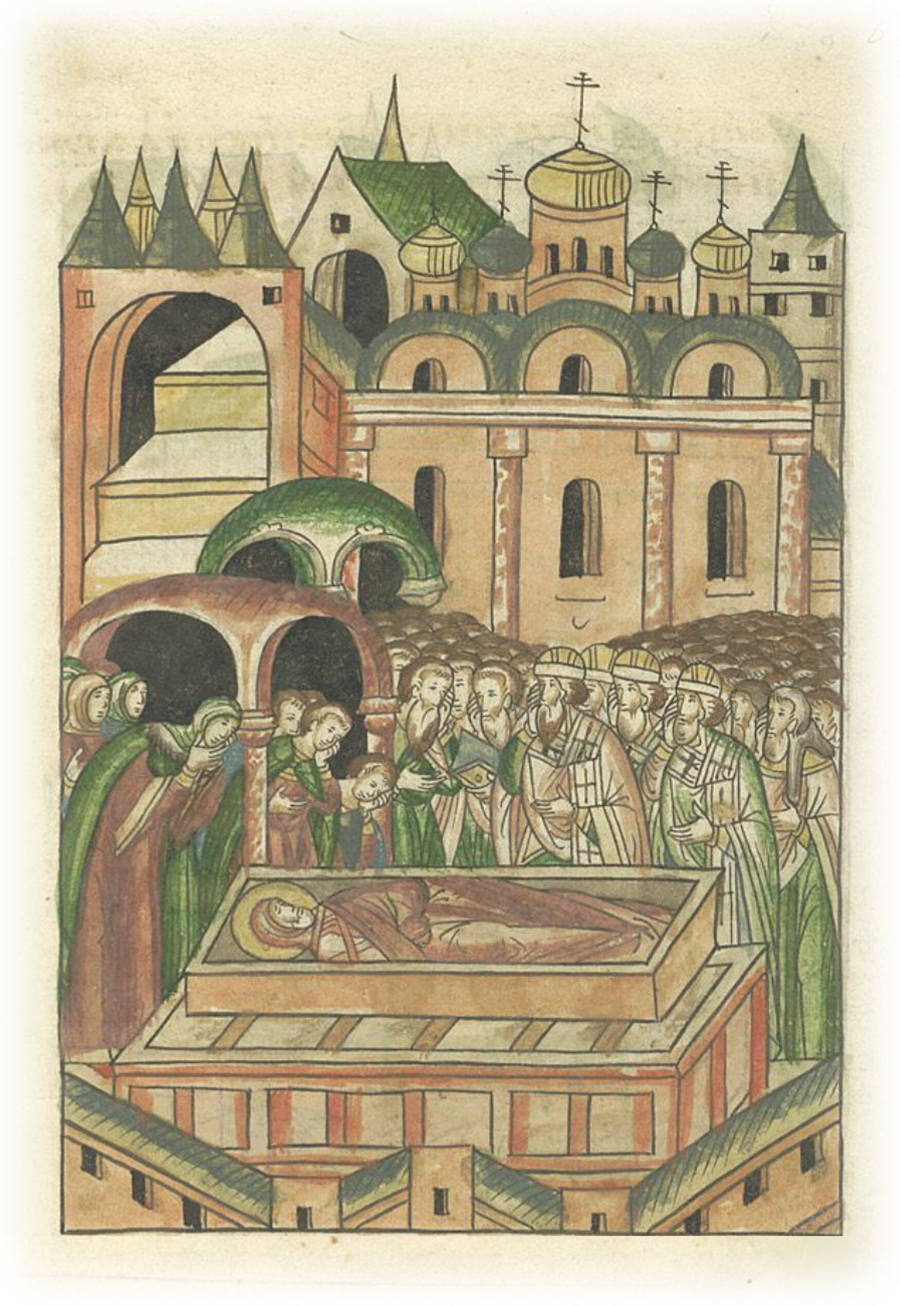 И, отпев его по обычаю, положили в гроб месяца мая в 20 день, на память святого мученика Фалалея. И плакали над ним князья и бояре, и архиепископы, и весь народ. И не было никого, кто бы не плакал, и не было слышно пения от сильного плача.
