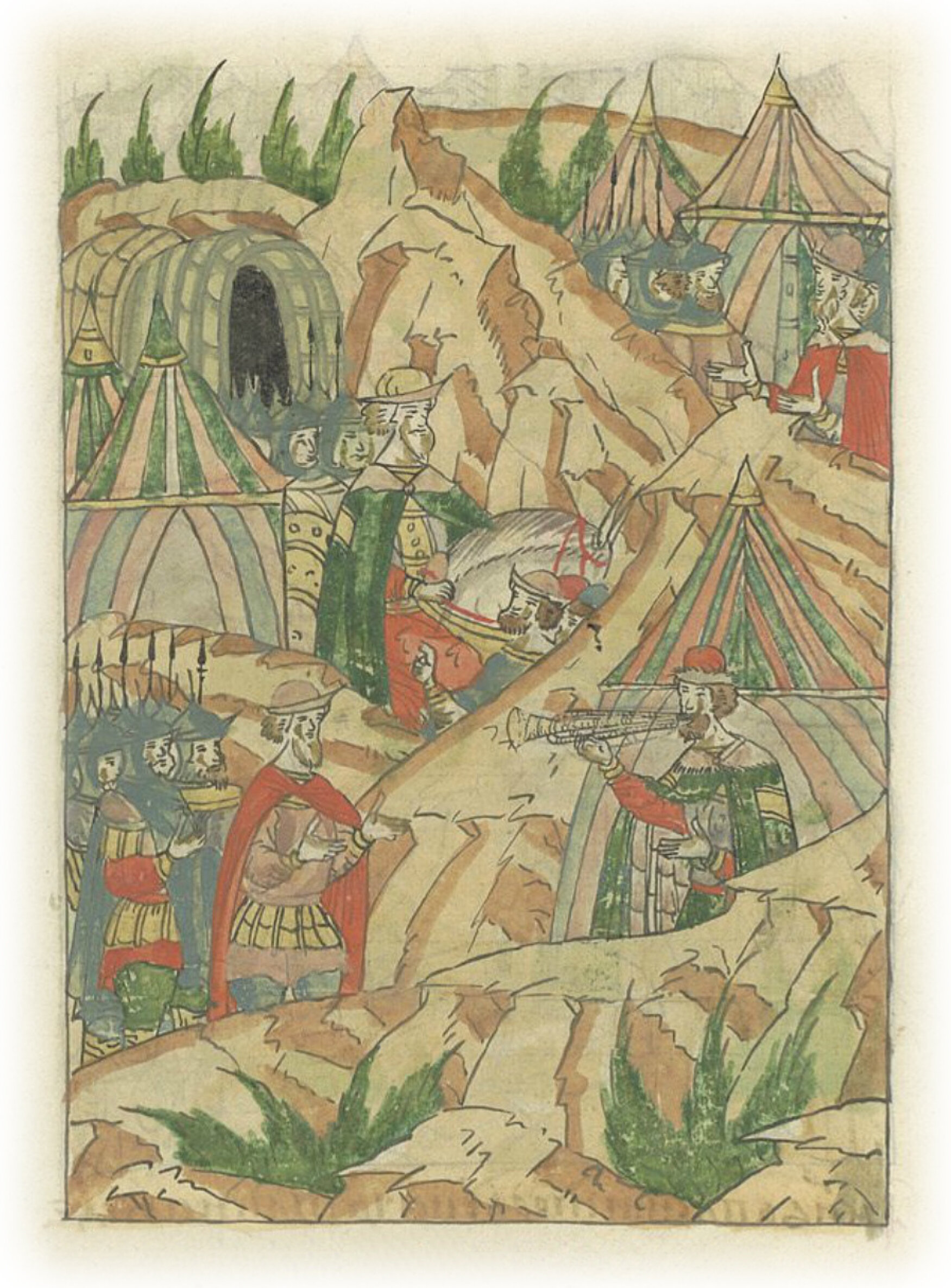 Князь великий Василий Васильевич разослал гонцов по всем своим станам, а сам взял трубу и начал трубить; и в тот же час собрались полки великого князя Василия Васильевича.