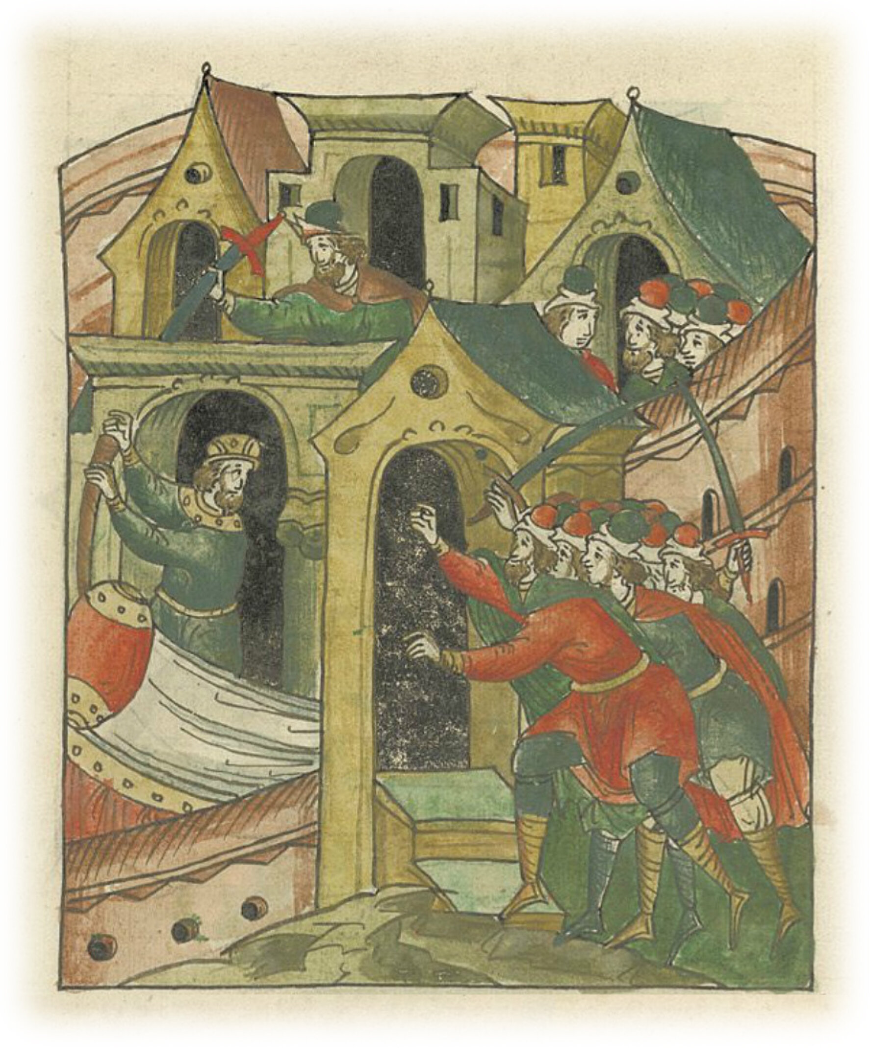 Убийство великого князя Андрея Юрьевича Боголюбского во Владимире Кучковичами. Убийцы, услышав голос князя, стали ломиться к нему в спальню.