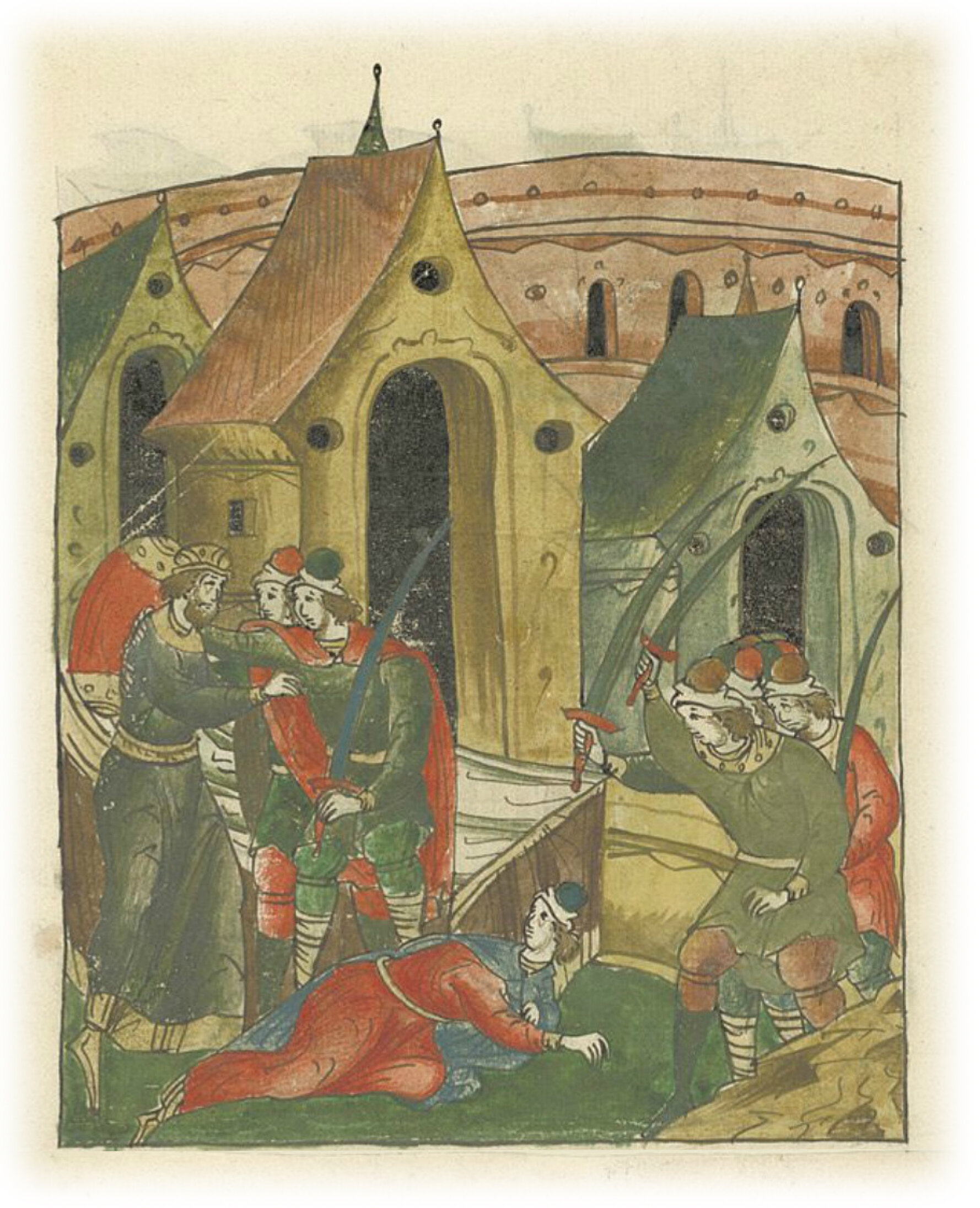 Убийство великого князя Андрея Юрьевича Боголюбского во Владимире Кучковичами. Ворвавшись в спальню, двое убийц хватают князя; он же подминает одного из них под себя, и остальные, думая, что на полу князь, убивают своего советника.
