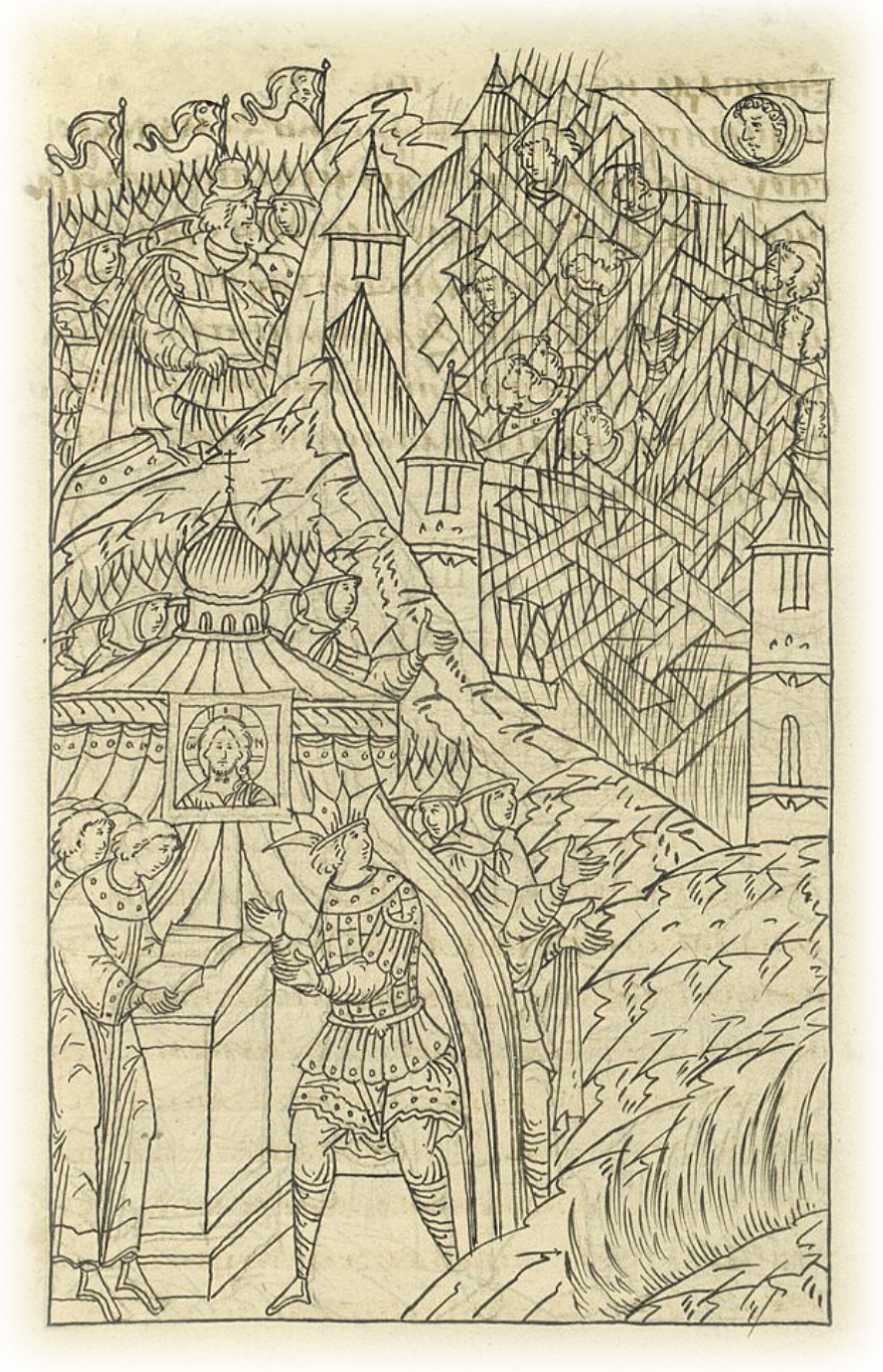 Моление царское. Сам же благочестивый царь на образ Христа Бога нашего прилежно взирал и на родившую Его Богоматерь, и на угодника его великого Сергия. И тут подходит он к иконе чудотворца, который с живого светильника начертан, в сердце своем тайно беспрестанные молитвы воссылая, из очей же его река слез изливалась, а явственно так говорил: «О, Владыка, премилостивый Христос, помилуй рабов своих! Пришло время милости Твоей! Подай нам, рабам Твоим, крепость на сопротивных! Помилуй, Милостивый, помилуй падших рабов Твоих, человеколюбче! Восстань на благо и плененных и сирых освободи! Пошли милосердие, милость свою древнюю свыше, и поймут нечестивые, что ты, Бог наш, на Тебя уповая, побеждаем. И Ты, о, пречистая Владычица Богородица, умоли родившегося от Тебя Христа, истинного Бога нашего, да не помянет грехов моих и беззаконий великих, сколько согрешил перед величеством славы Его, но помилуй меня ради великой милости своей! Ты, Владычица, помощницей нам будь и всему воинству нашему, на тебя надеясь, не посрамимся в сражениях, молитвами твоими и всех святителей русских чудотворцев и сродников наших, молитвенников и помощни- ков против сопротивных».