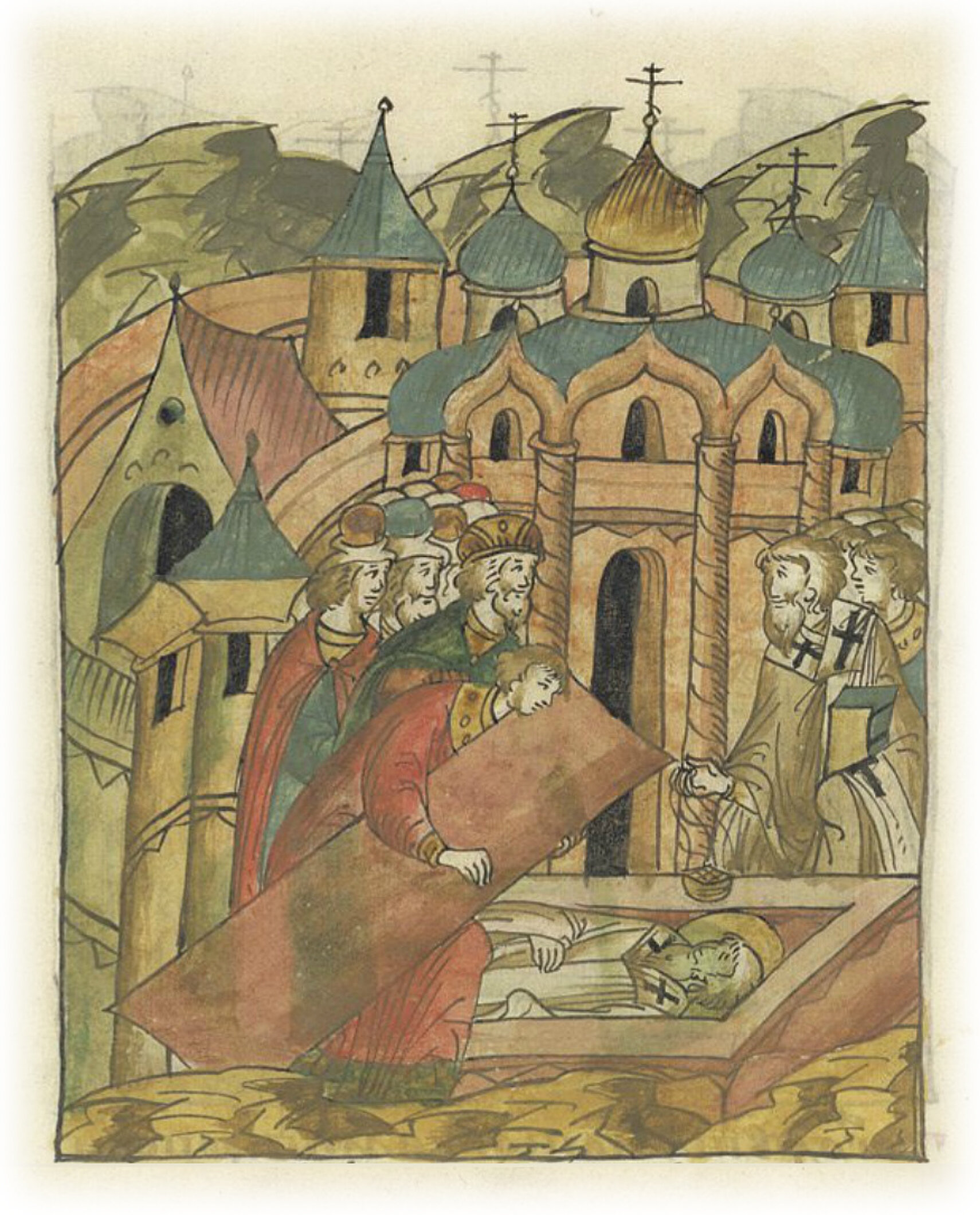 Кончина Ростовского епископа Пахомия и его похороны в церкви пречистой Богородицы в Ростове.