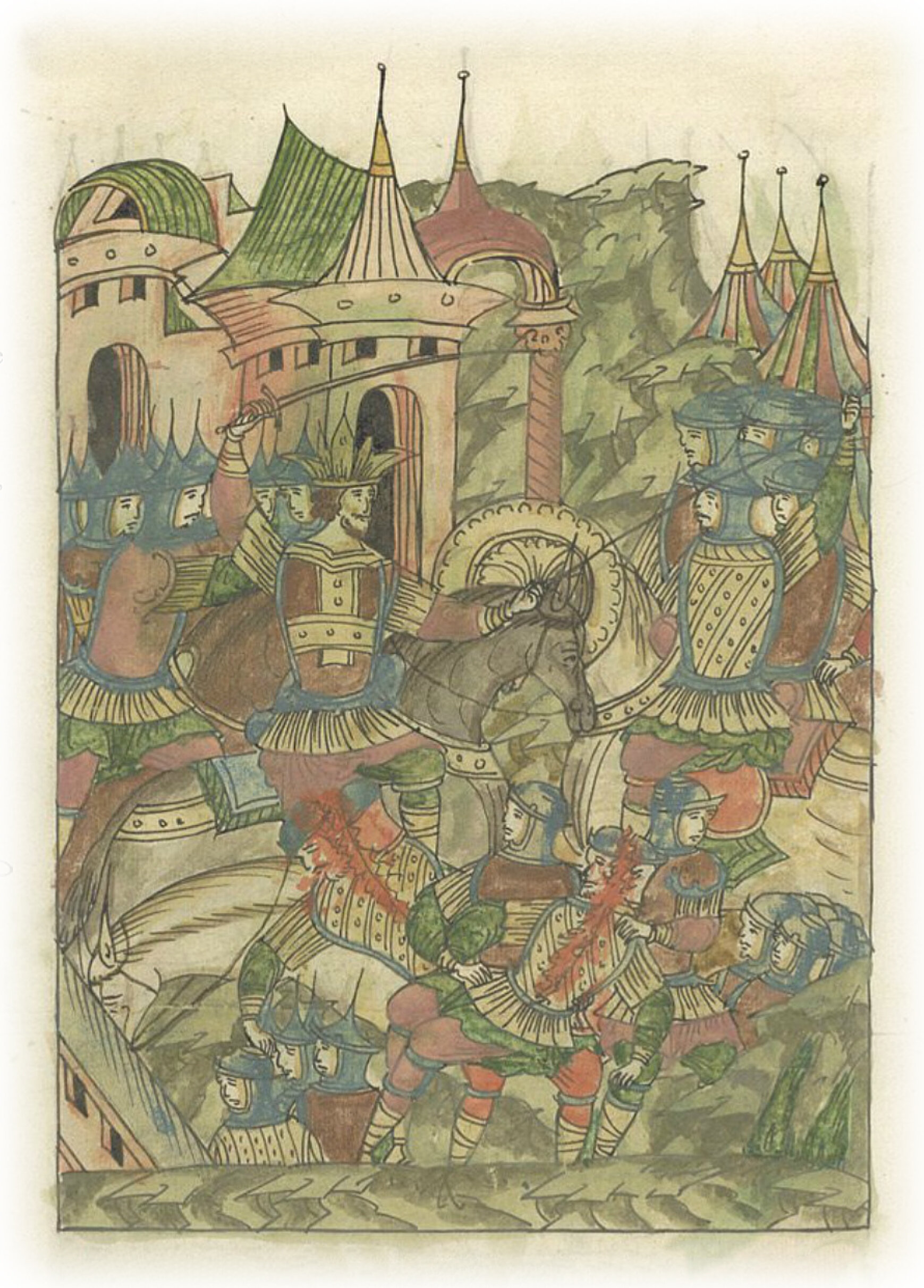 и, взяв копье, напустил на царя; царь щитом отвел копье и ударил его мечом в голову, и рассек надвое до седла. И тотчас возопили турки многими голосами, взяли его, и унесли.