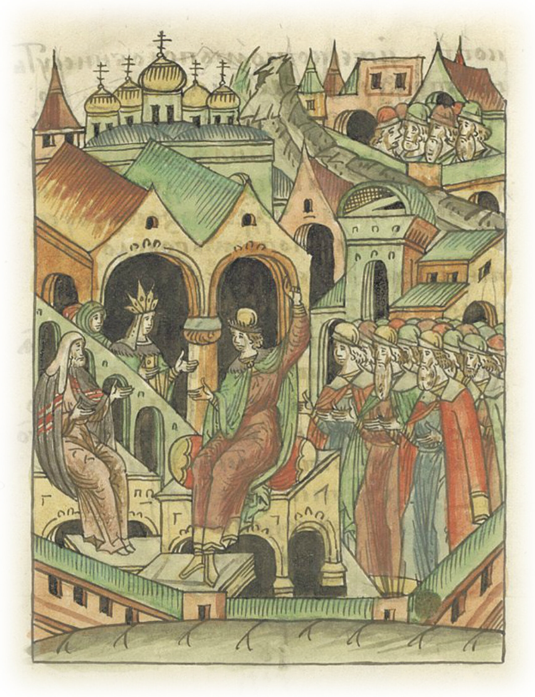 Князь же великий, услышав об этом, скорбен был и тужил о них немало. Такого (не было), даже когда были не в православии, от Рюрика и до великого князя Владимира не отступали, желая иного государя. И от Владимира и до сего дня один его род знали и управлялись всеми великими князьями во всем, сначала Киевскими, потом – Владимирскими. А в последние годы все свое сгубить хотят, от христианства к латинству отступая. (И он думал): «Что сделать, не знаю, но положу упование на одного Господа Бога». И долго думав об этом, возвещает отцу своему (духовному) митрополиту Филиппу и матери своей великой княгине Марии, и бывшим у него боярам его, что хочет идти на Новгород ратью. Они же, услышав это, посоветовали ему, положив надежду на Бога, исполнить мысль свою против новгородцев за их нарушение договора и отступление.