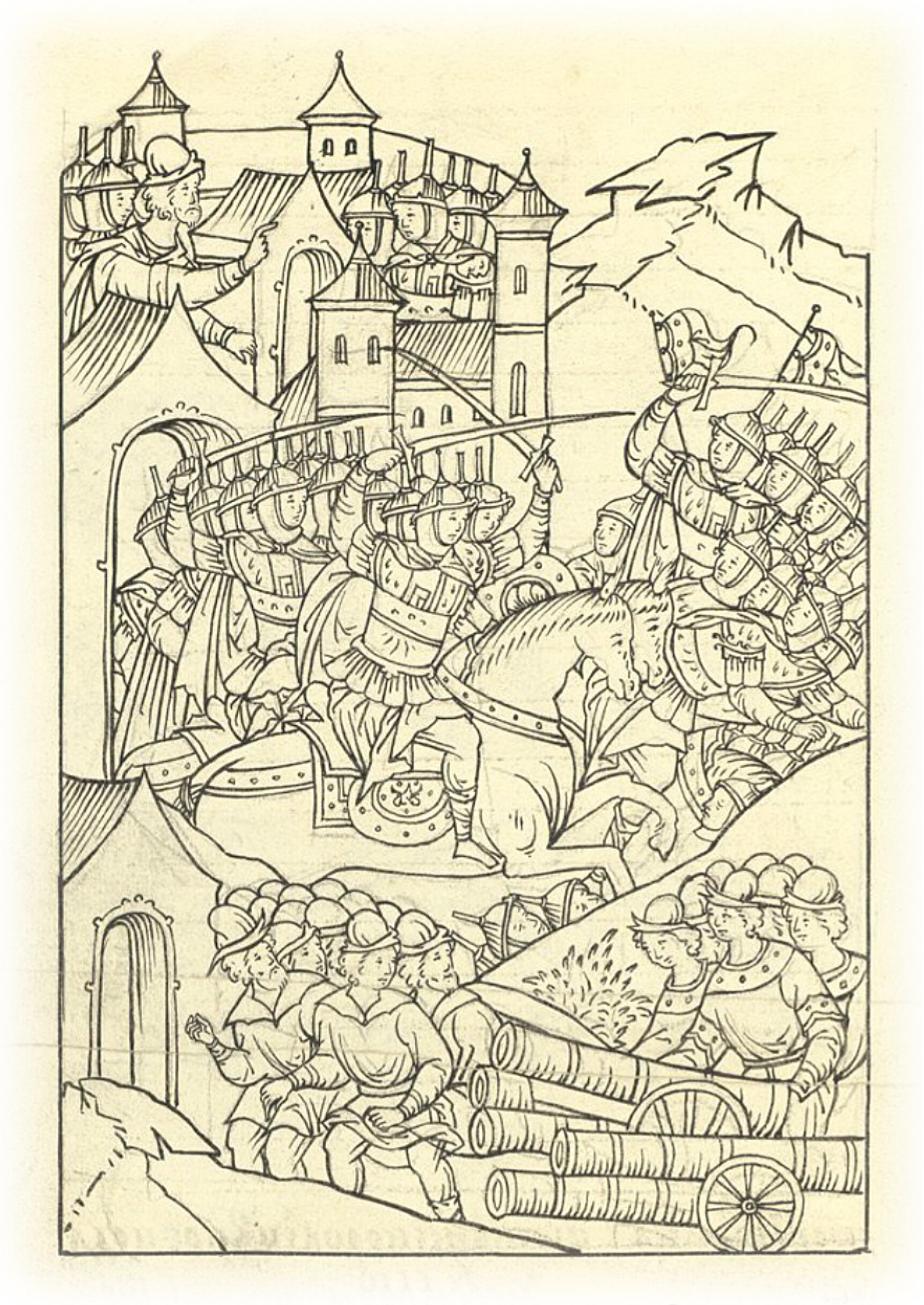 Языки говорят воеводам царя Ивана Васильевича, что магистр окопался большим рвом вокруг города Рындола, бьет из пушек и пищалей и приступает к Рындолу.