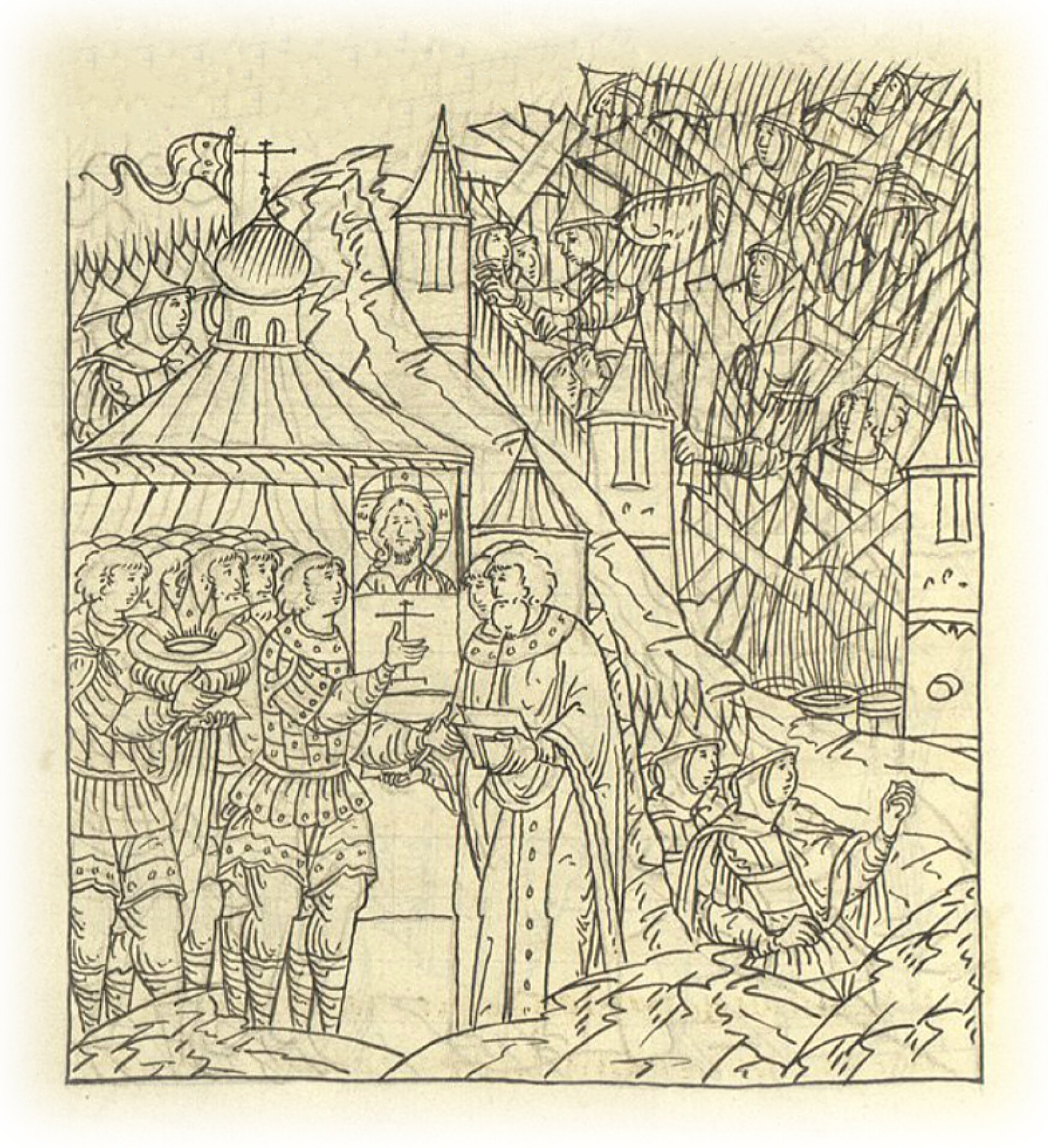 О взрыве подкопа. И пришло время на литургии читать святое Евангелие, солнце уже всходило, и когда закончил дьякон и возгласил последнюю строку в Евангелии: «И будет едино стадо и един пастырь», тотчас словно сильный гром грянул, земля дрогнула и потряслась. Благочестивый же царь из церковных дверей вышел и увидел городскую стену, подкопом вырванную, и страшно было видеть, как земля, словно во тьме, поднялась на великую высоту, и разметало многие бревна и нечестивых.